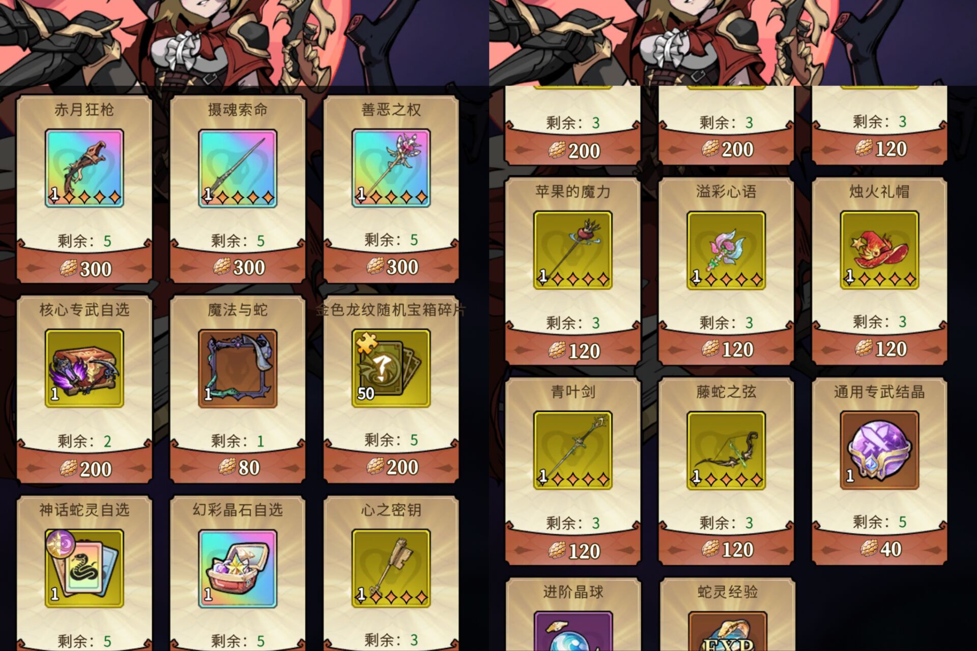 自带商店可厉害了不仅有三大耀辉专武,还有核心专武自选、神话蛇灵自选、以及各类其他角色的专武。