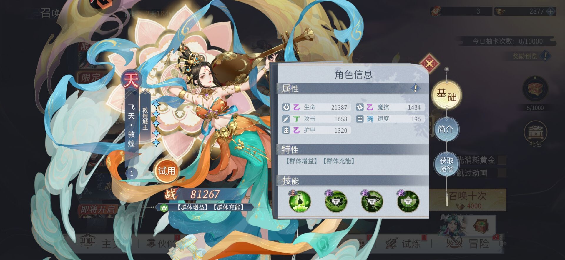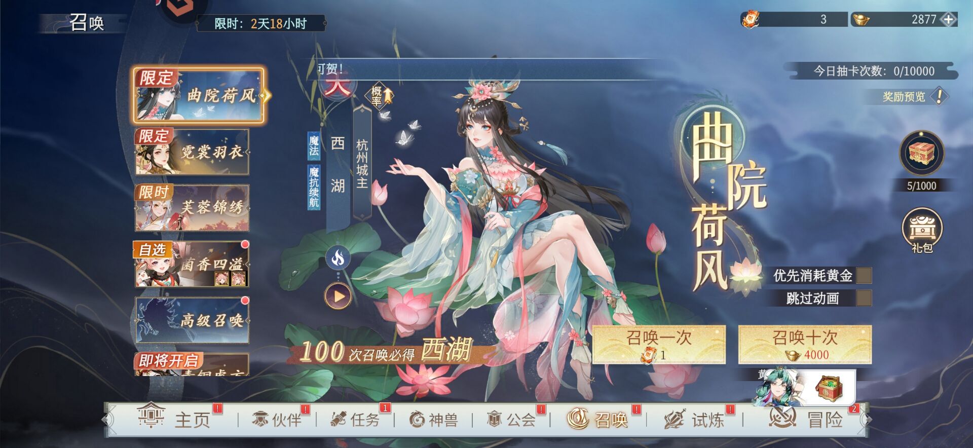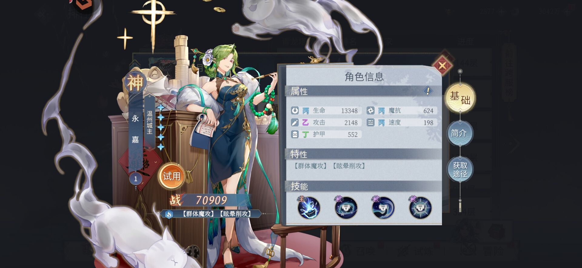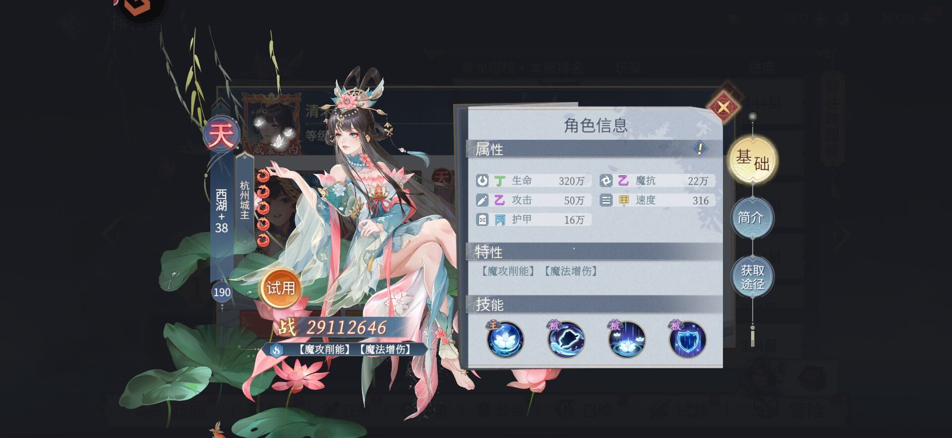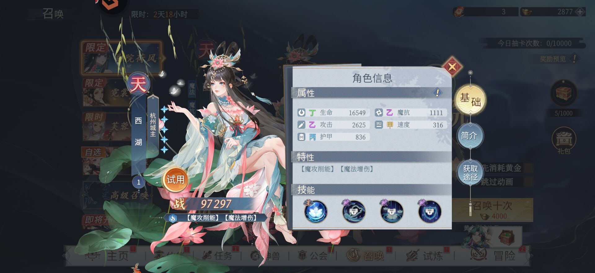 抽取建议:5星⭐⭐⭐⭐⭐。现在有元宝和限定票的玩家又缺少这种功能性极强的法c无脑抽就行,西湖是非常百搭的所有的阵容都可以搭配。
