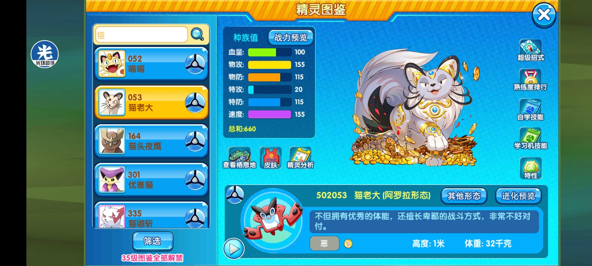 总结:猫老大其实不值这一种形态,在原版中喵喵就是人气宠物,所以除了普通形态和阿罗拉形态,它还有专门的伽勒尔形态和极巨化形态,可以说是原版中形态非常多的一个宠物了,如果复刻能持续下去,出钢属性的伽勒尔形态也是很有可能,好了,本期关于它的介绍就到这里,我是@白,我们下期再见,想看更多新宠资料,可以点我头像关注我查找,记得点个赞呦!