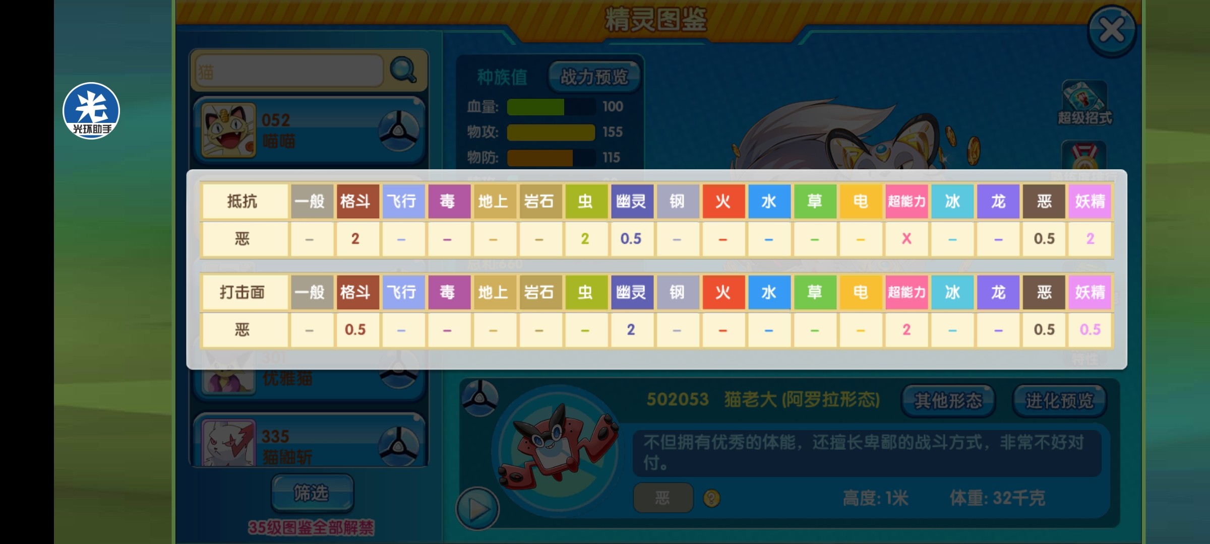 属性单恶,而单看这个属性,属于那种中规的属性,不算好也不算差,毕竟抗性大多为一倍,抵抗2倍弱虫、格斗、妖精,2倍抵抗幽灵、恶,免疫超能。在当前版本,怕的主要就是pvp场上的妖精系宠,妖精鹿之类,还有格斗系强势的超梦Z。不过它的打击面克制幽灵系和超能系,在当前版本来说,最克制的就是超能系+幽灵系的月神了。