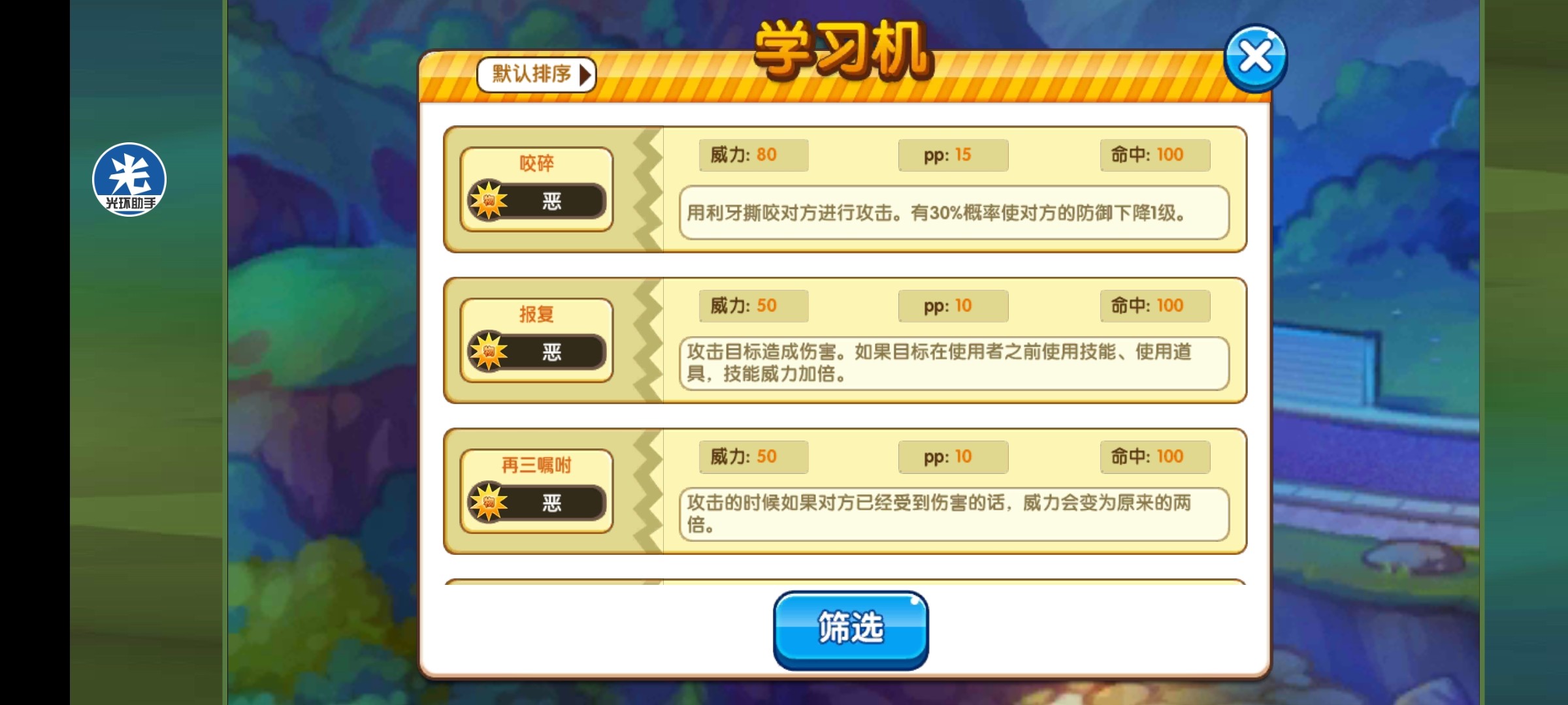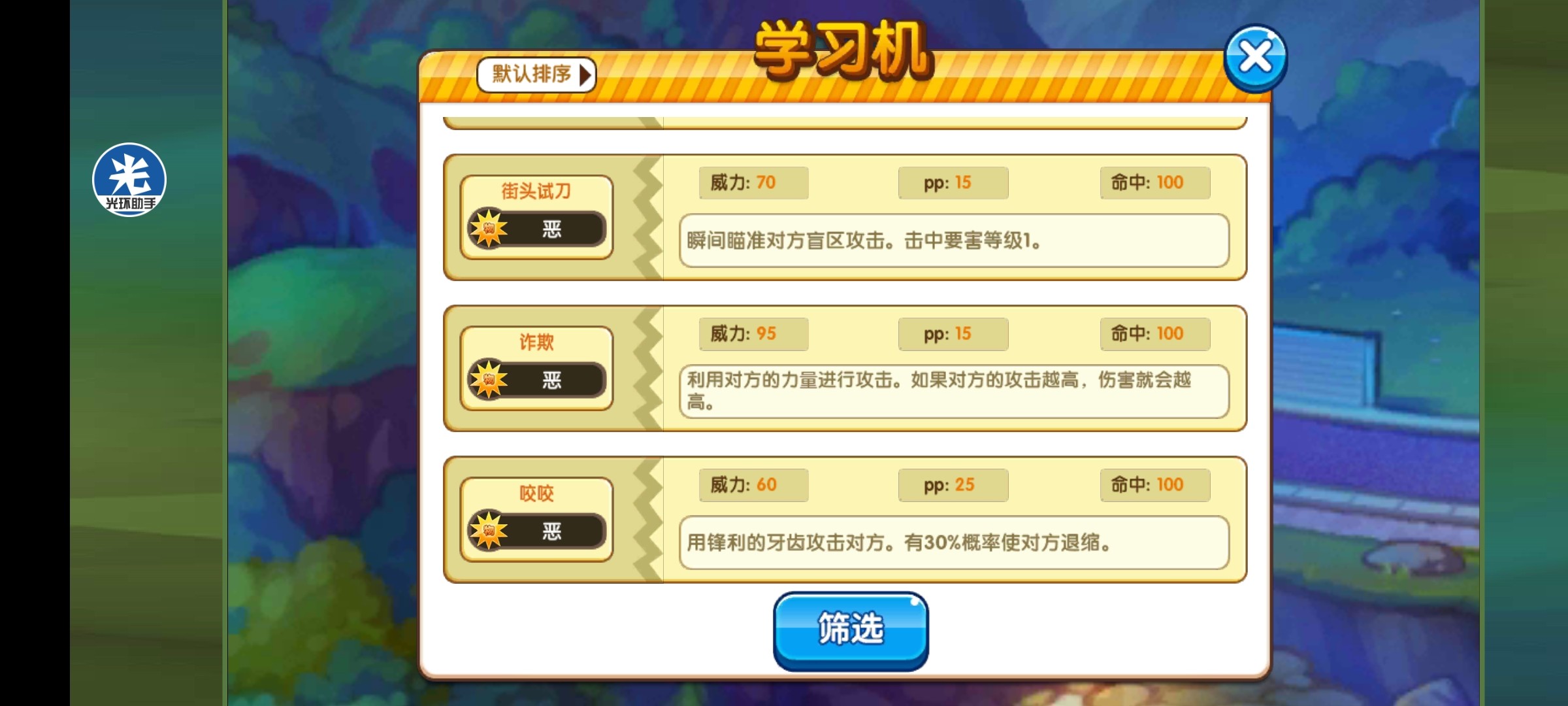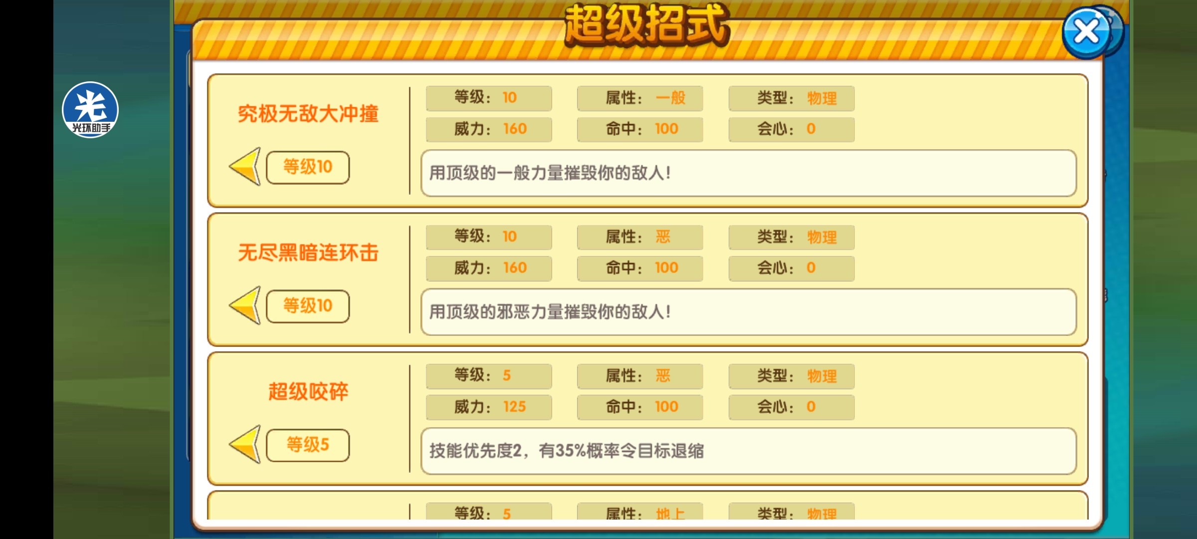街头试刀/影子狗爪/欺诈/火之鞭打/嬉闹+噪音/假哭/拦堵/挑拨/催眠术+铁尾/咬碎/极速转变+月光