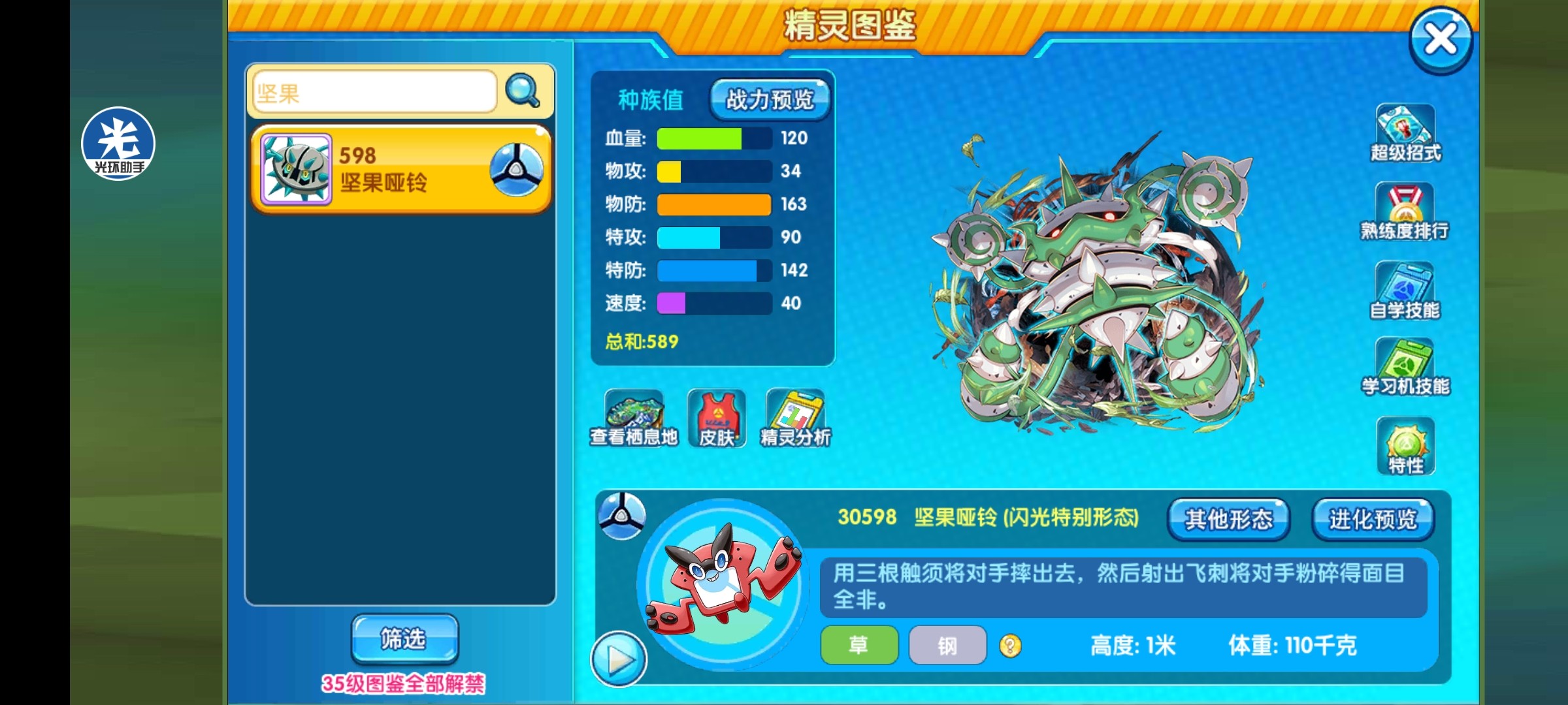 坚果哑铃和钢球有点像,是复刻中比较冷门的一个宠物。和它类似的还有钢球,不过钢球即便开放mega也作用不大,但是它不同,因为它有回复,原版中它挥舞三条带刺的触手战斗,拥有粉碎巨岩的破坏力。挂在山洞顶部,用铁棘砸向从下面经过的猎物。因为出色的抵抗力与两防种族,成为当时黑白对战环境里排在水晶灯火灵后的第二热门精灵,复刻中这次给它开放mega,也只针对闪光。