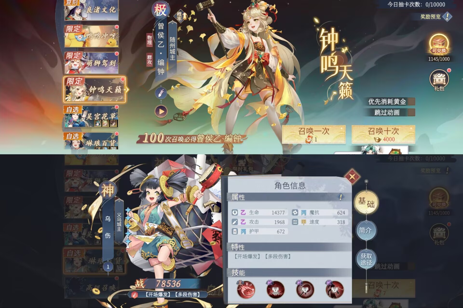 本期给大家讲下新登场的【编钟】和【乌伤】分析总结和抽取建议,希望能够帮助到有需要的玩家。
