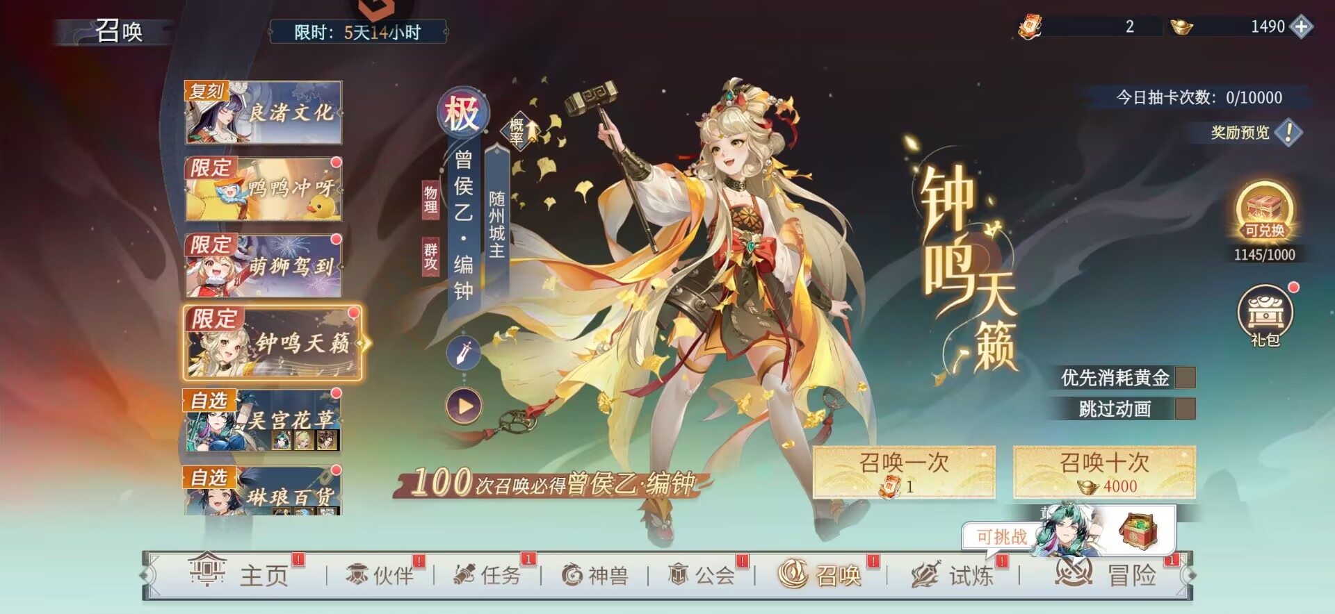 而且现在大家的卷和元宝都比较缺,在资源匮乏的情况下,推荐大家优先抽【宝船】【新淦】【编钟】这些刚需的物理c位卡。