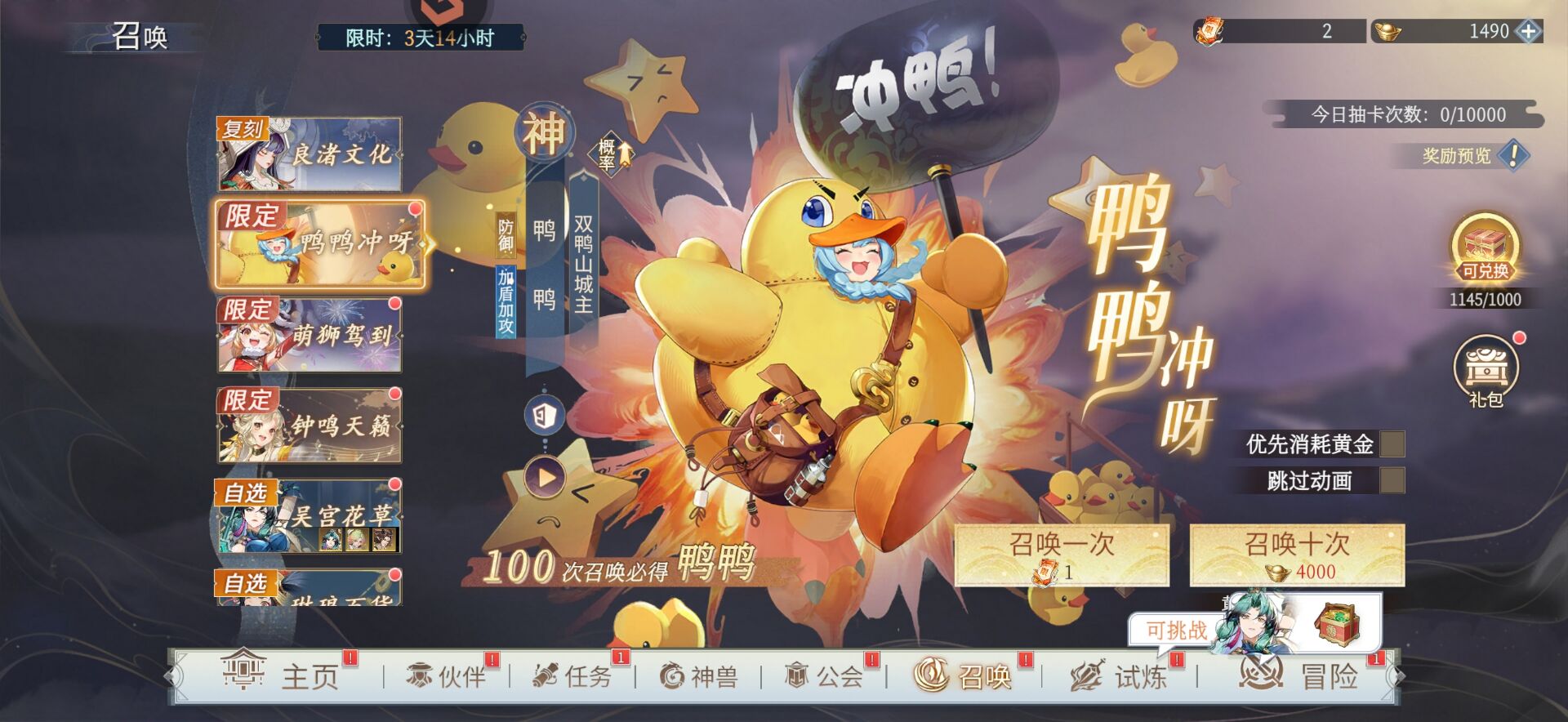 三:最后。以上就是【第11轮限时卡池】编钟和乌伤分析总结和抽取建议攻略,希望能够帮助到大家啦另外【鸭鸭】也返场了!