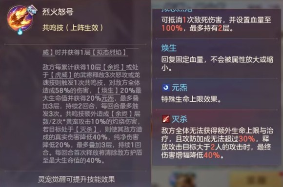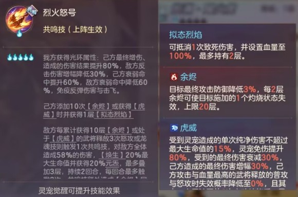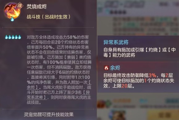 火烧宠,没有破精准格挡,直接上纯净伤害。上阵3名异常类武将时,助战可获得主战技能,目的是弥补目前火烧伤害不足的缺点。此外挂衰弱类灼烧,100%概率立即结算一次,且不消耗层数,看起来很逆天,待实测验证。