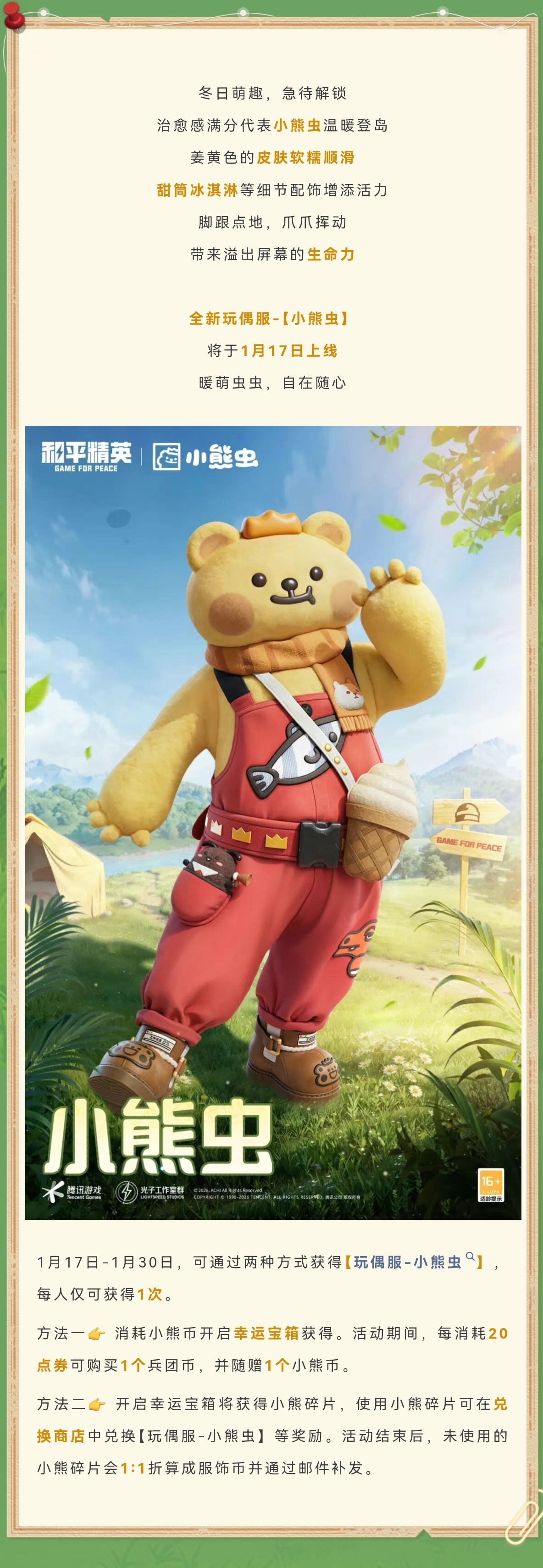 新皮肤爆料 | 暖萌虫虫,自在随心!全新玩偶服-【小熊虫】将于1月17日正式上线~