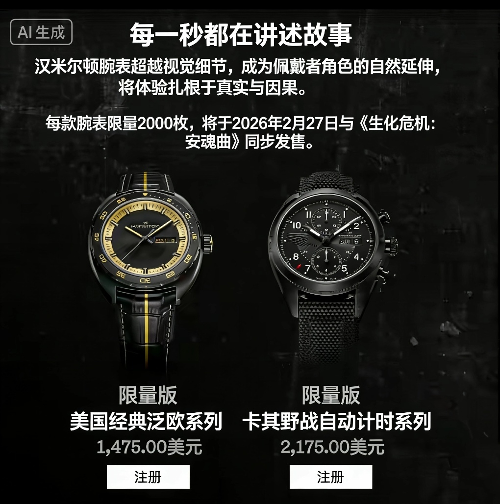 游戏发布会刚结束,推特用户 WARIO64 就发现,这些手表已在汉密尔顿官网开启预售。格蕾丝佩戴的是经典的 PAN EUROP手表,售价 1475 美元(约合人民币 1.03 万元);里昂的则是一款 KHAKl FIElD AUTO CHRONO 防水腕表,售价 2175 美元(约合人民币 1.52 万元)。两款手表均限量 2000 枚,未来势必成为收藏市场的热门藏品。