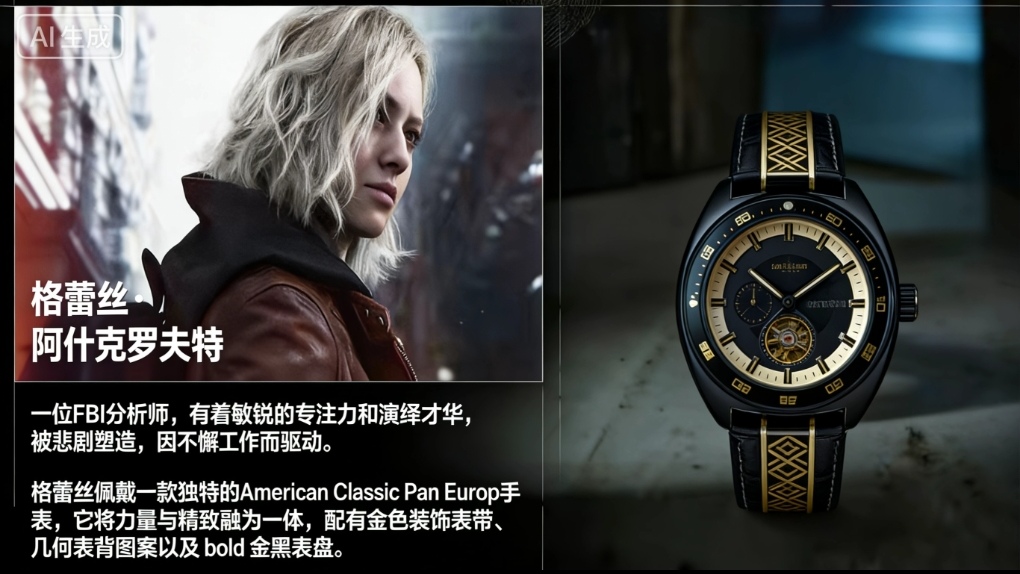 发布会上亮相了两项合作:其一是与保时捷集团的跑车联动,里昂在游戏中驾驶的限量座驾也在现实中登场,占据了不少展示时间;其二则是与奢侈品牌汉密尔顿合作推出的限量版手表,分别对应游戏角色格蕾丝和里昂的同款。