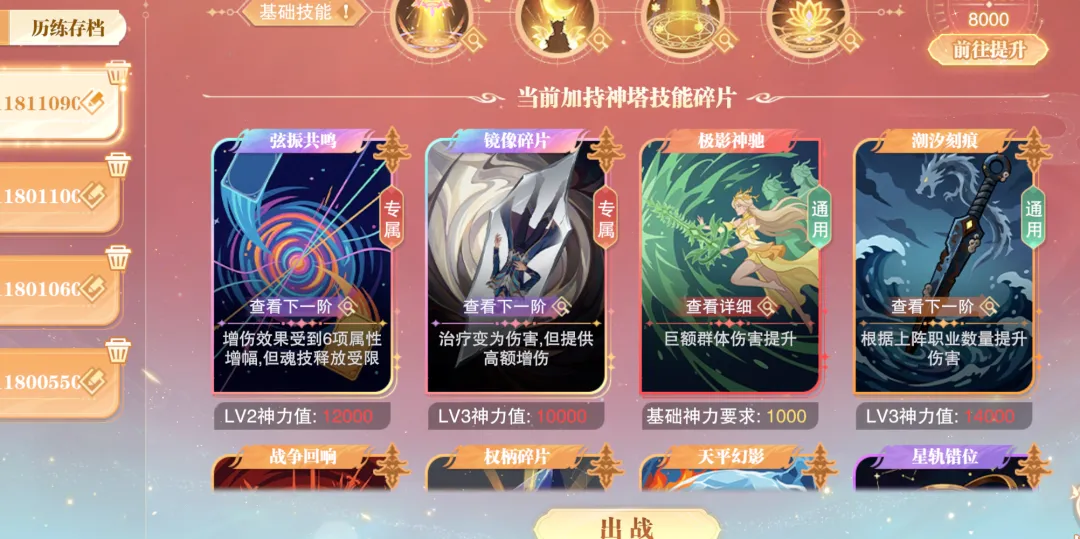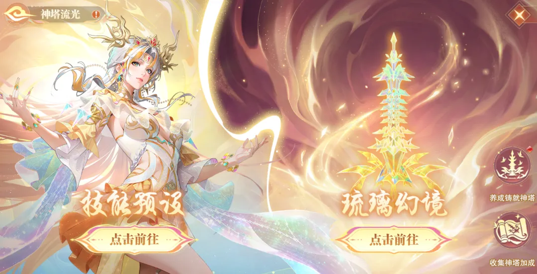 首先需要指出的是,SP+宁荣荣绝大部分的能力都来自于“神塔流光”系统中的卡牌搭配,那么如下图所示官方也为我们的短图、PVP和长图分别预设好了三套卡组,大家只需要在对应卡组的下边直接点出战即可。