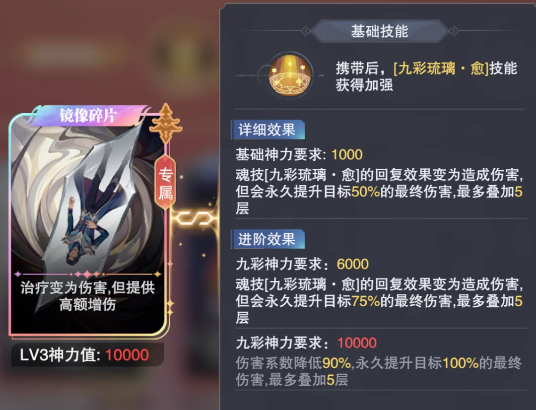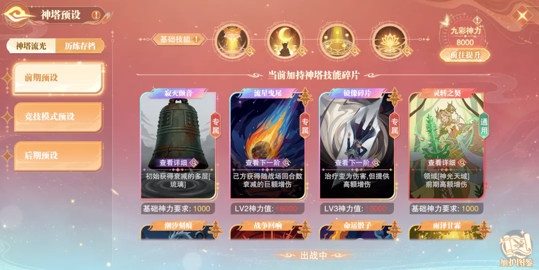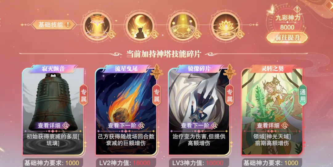 同时SP+宁荣荣的星级也会影响上图右上角的这个“九彩神力”,大家可以看到不同卡牌底下也会写到“基础神力要求”、“LV2神力值”等等字样,而这个不同的卡牌等级效果也就是和我们SP+宁荣荣星级所对应的九彩神力绑定的,SP+宁荣荣的星级越高则九彩神力值越高,相应能够解锁不同卡牌的等级效果也就越高,这便是提升SP+宁荣荣星级所带来的一个增益。