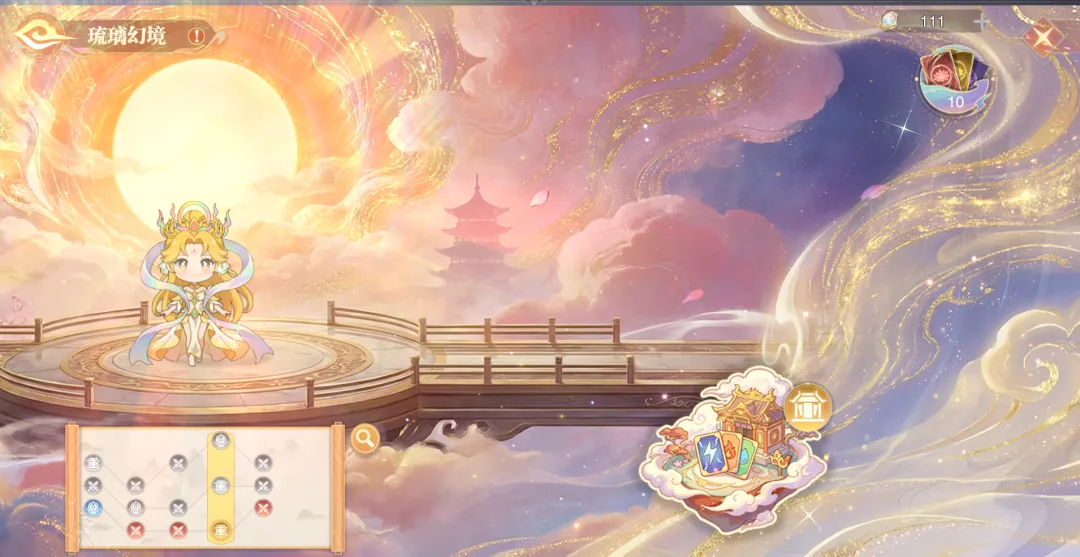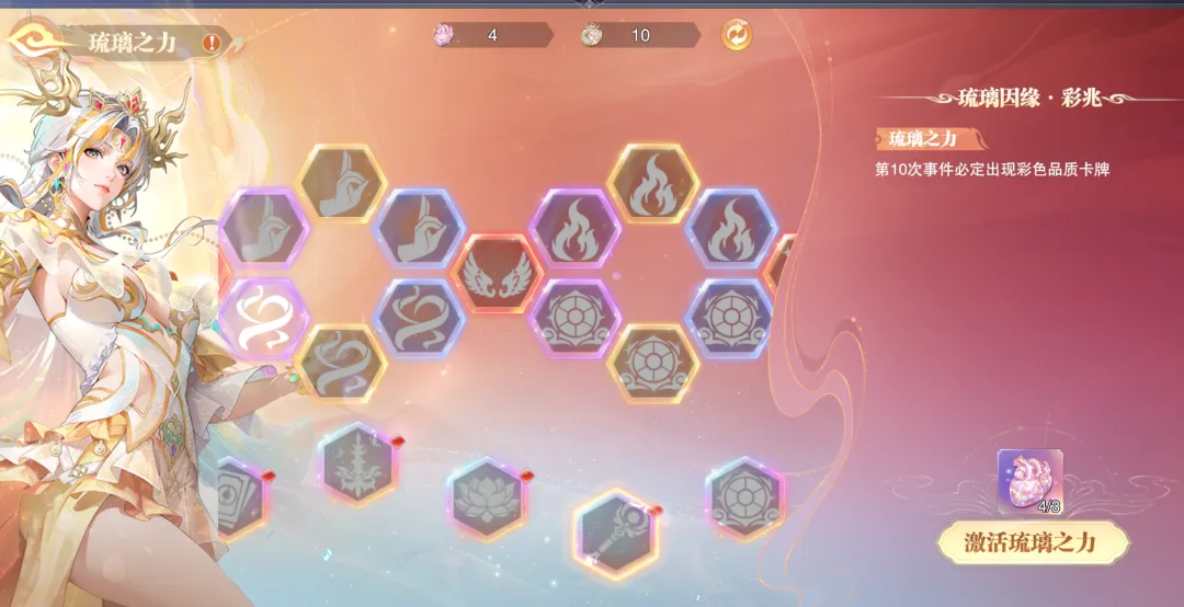 不过由于小游戏中随机的事件和卡牌总数也达到40+张,所以想要组成一套心仪的高效长图、短图和PVP卡组,运气也非常重要的,当然快速养成SP+宁荣荣也可以带来在运气上的保底提升,例如下图中的这个琉璃之力系统,上边的这种一个接一个的蜂窝状buff是我们可以通过不断地玩小游戏来积攒资源解锁的。