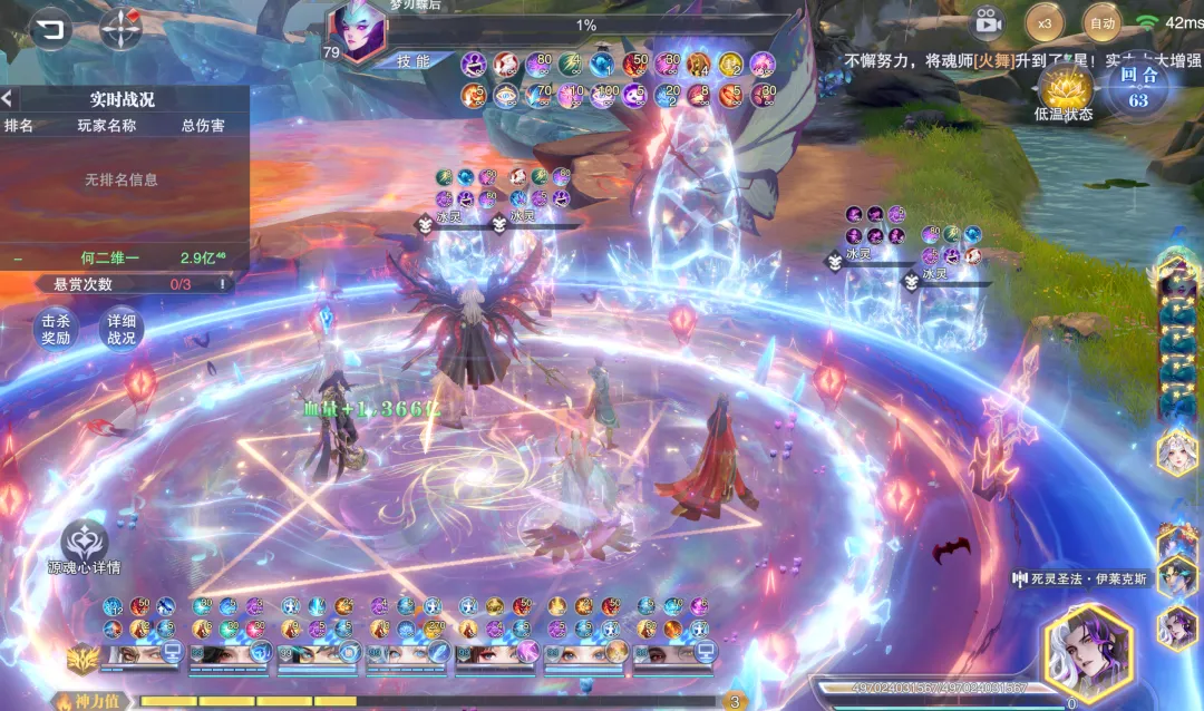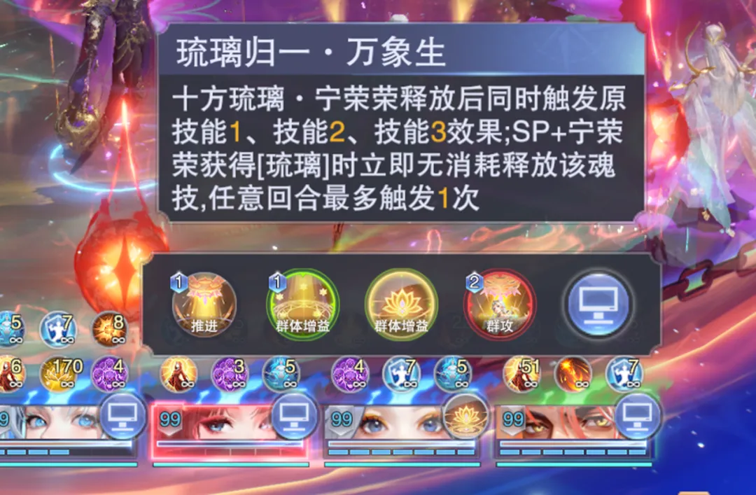 此后我们可以一直锁这个新出的【琉璃归一·万象生】技能即可,然后蓝色光标给到咱们的主C。、