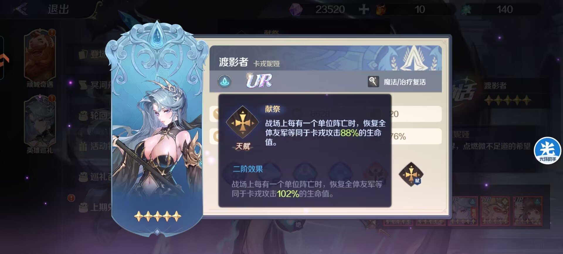 战斗中每死亡一个单位,卡戎妮娅都可以给全体队友回血,基础奶量有88%倍率,效果还行不算太差,天赋配合卡戎妮娅的技能治疗可以更加稳定的加强队伍的续航,算上锦上添花。