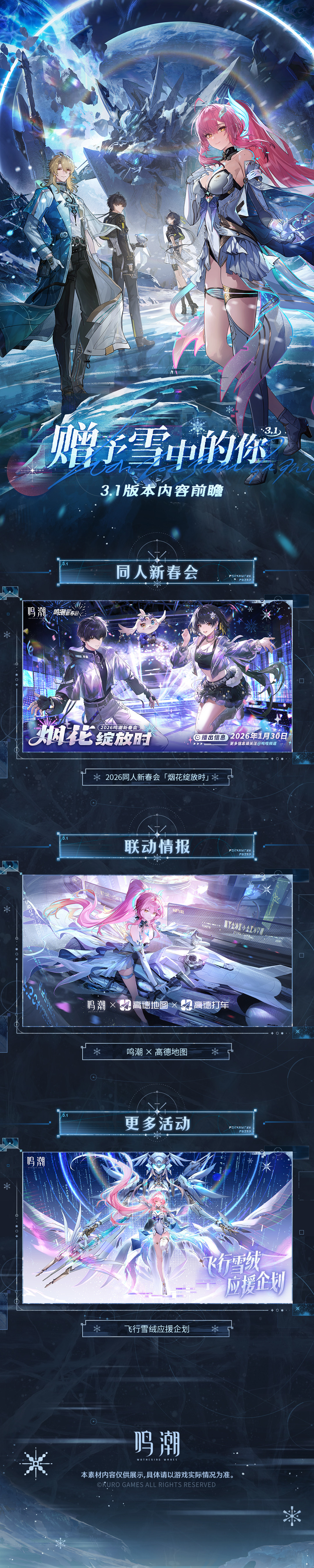 《鸣潮》版本前瞻 | 3.1版本「赠予雪中的你」2月5日即将更新光环小G发布于 01-26关注《鸣潮》版本前瞻 | 3.1版本「赠予雪中的你」2月5日即将更新《鸣潮》3.1版本前瞻通讯现已结束。漂泊者可点击下方图片,回顾本次前瞻通讯的精彩内容!