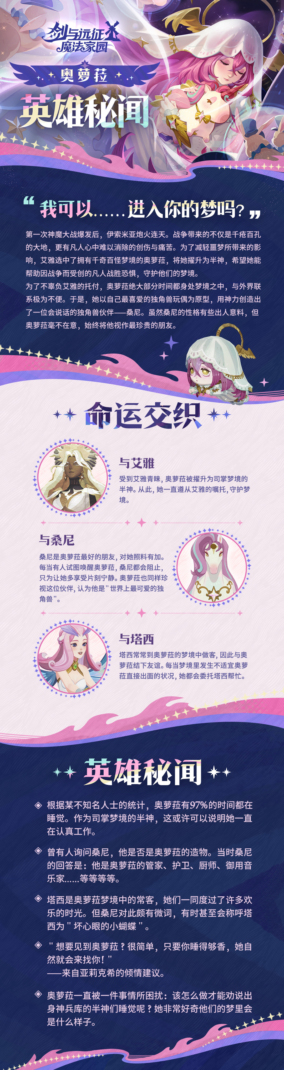 为了不辜负艾雅的托付,奥萝菈将绝大部分时光都倾注在梦境之中,与外界的联系也因此变得极为不便。于是,她以自己最喜爱的独角兽玩偶为原型,用神力创造出了一位会说话的独角兽伙伴——桑尼,并将他视作最珍贵的朋友。