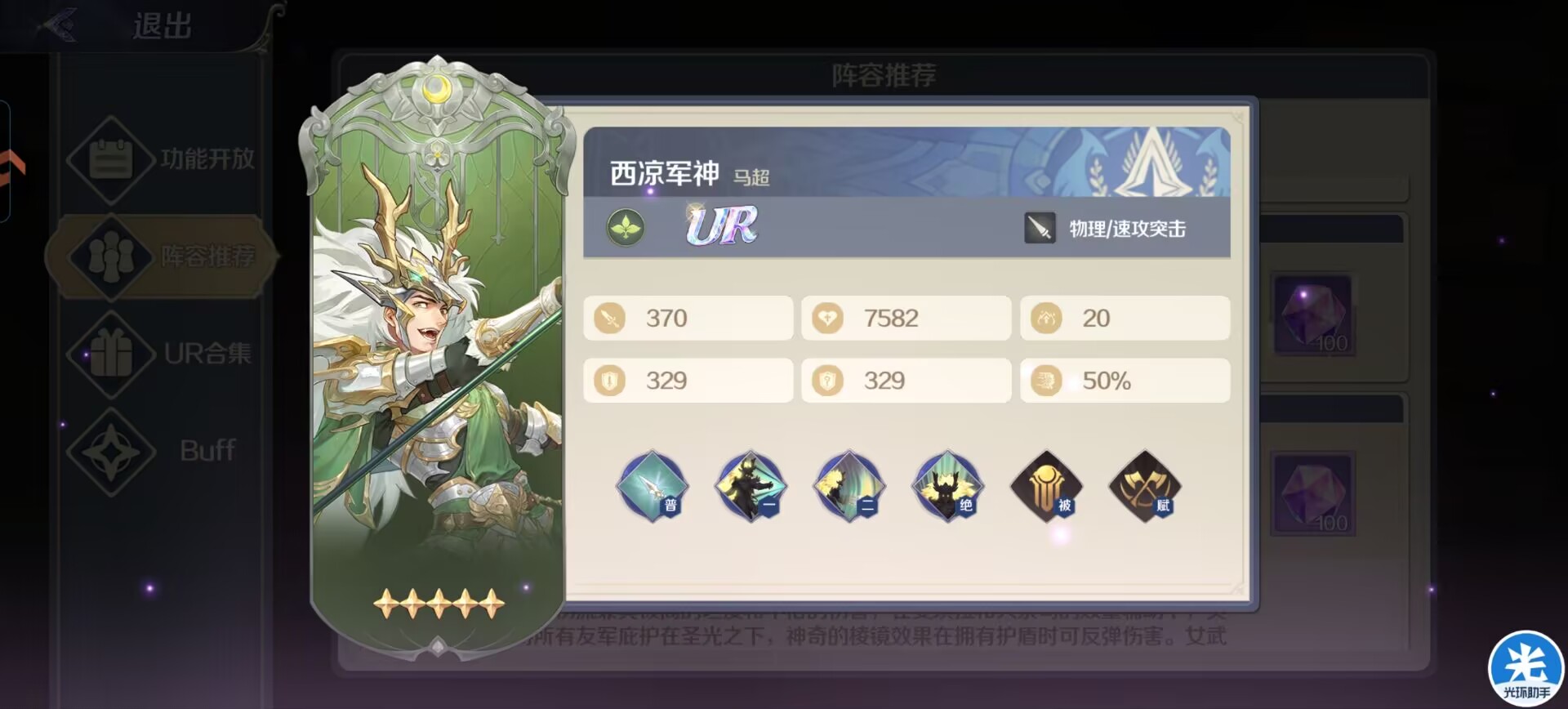 ③马超:核心输出,自带高吸血,伤害极高还可以降低敌人怒气,增强敌人受到的物理伤害,非常适合护盾队。