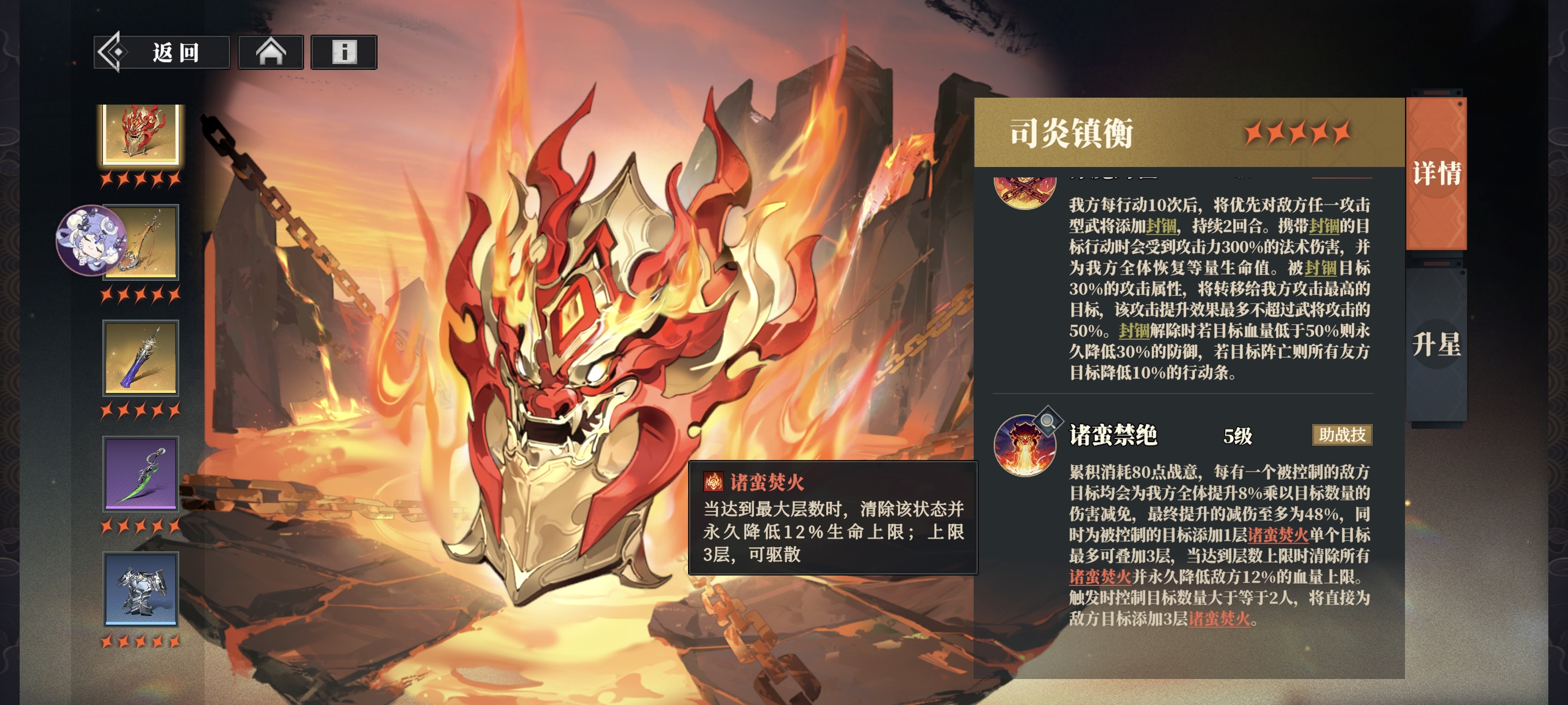 累积消耗一定战意触发,触发时根据敌方被控制数量为我方全体提升减伤,并为被控目标附加【诸蛮焚火】。