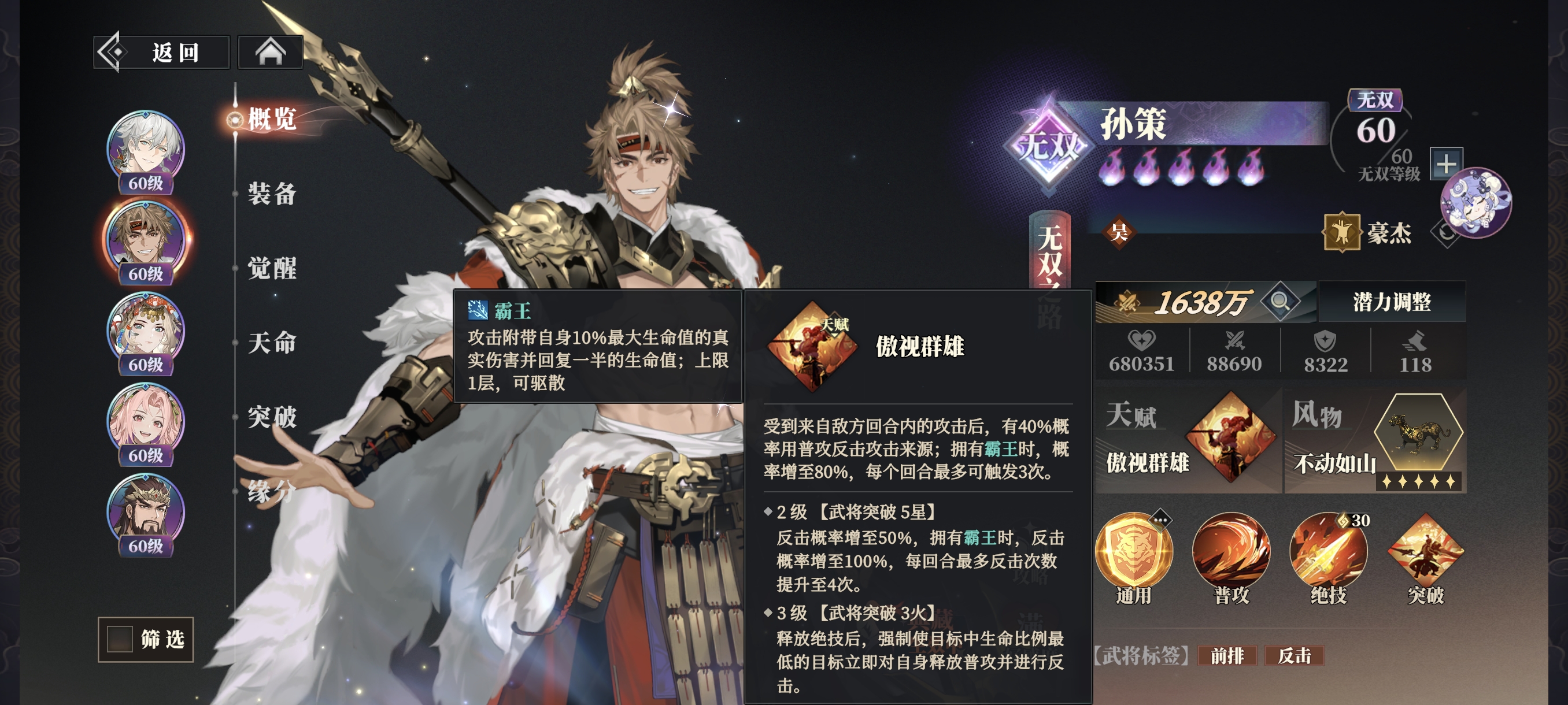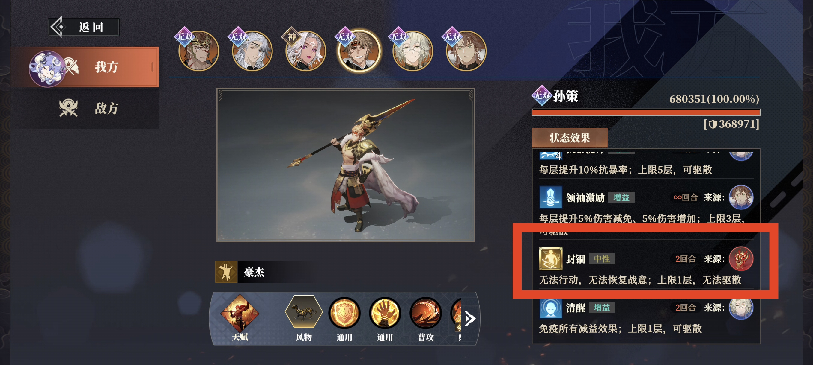 封锢为金色中性BUFF,不受减益/控制抵抗影响且无法驱散,不仅无法行动,也不会恢复战意,持续2回合。(孙策被封锢时无法触发反击)