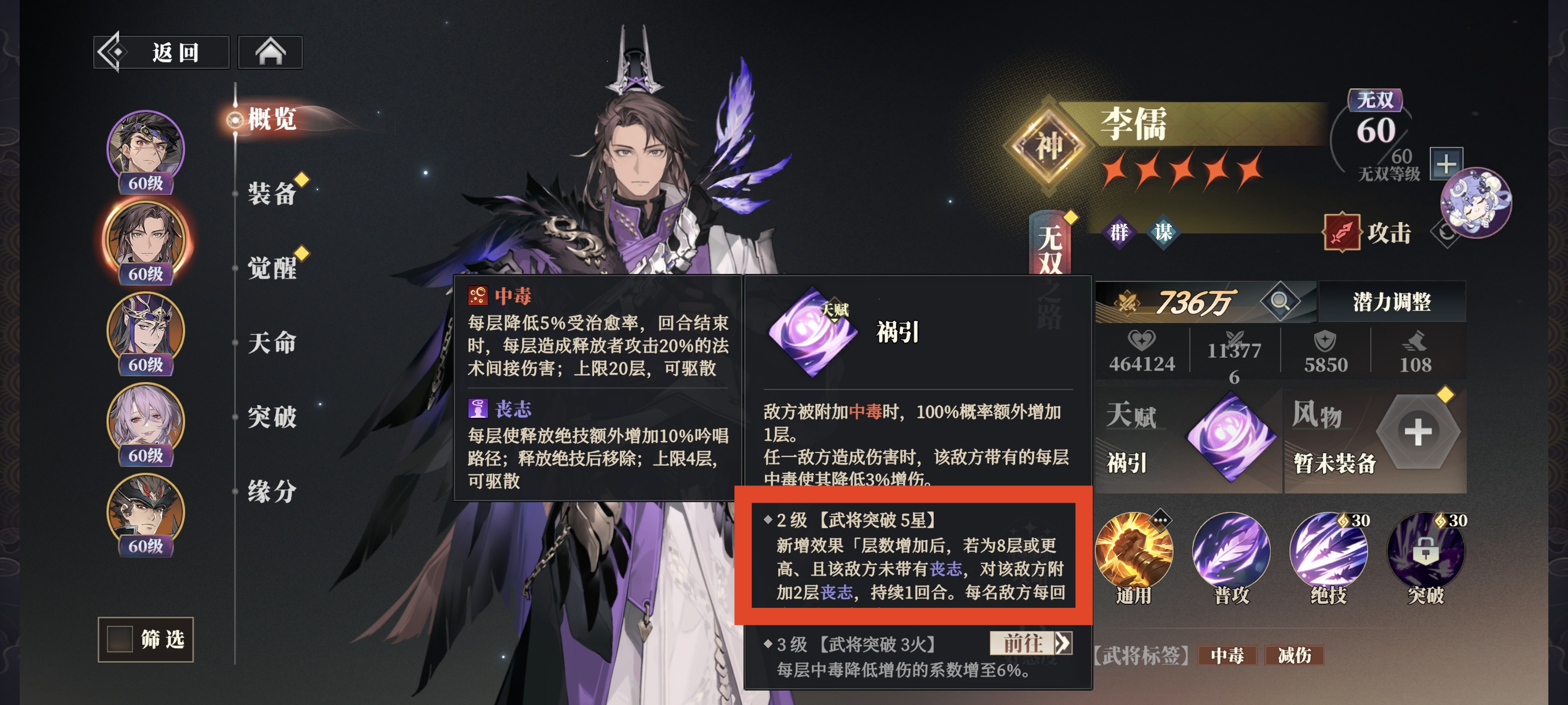 朱然和李儒都能高频为敌方附加【丧志】,基本可以保持敌方一直有控制效果存在,解决诸蛮禁绝触发难的问题。触发后能大幅提升我方全体减伤,非常契合毒队抗住伤害通过中毒磨死敌人的特点。