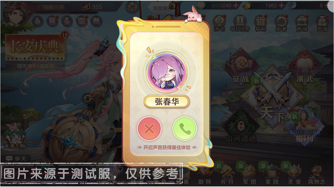 活动期间,小将军登入游戏可在主城上方查看春华来电,接听春华的语音电话,即可领取豪华奖励。内容包含「唤魂招募券」、「辰星金轮」、「幻穹券」等稀有道具。小将军记得要接通春华的电话哦~~