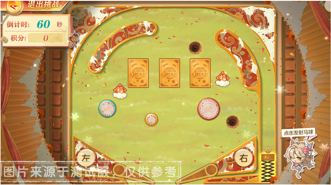 活动开启后将会从左到右解锁关卡,一共有四种不同的活动关卡。第一关为基础关卡,后三关内的马球则会自带不同的技能和玄机哦。进入关卡内,小将军点击右边武将小人形象发射马球,马球将被弹射到马球场内进行碰撞,马球通过撞击不同的建筑物和场上道具获得对应积分,当马球触碰到中央福卡可进行一次翻转,单局福卡全部朝上可将触发高额积分。注意按动马球场底部的【左】、【右】键防止马球掉落到场外哦。每局挑战限时60秒,一起来看看谁能获得最多积分!![]()