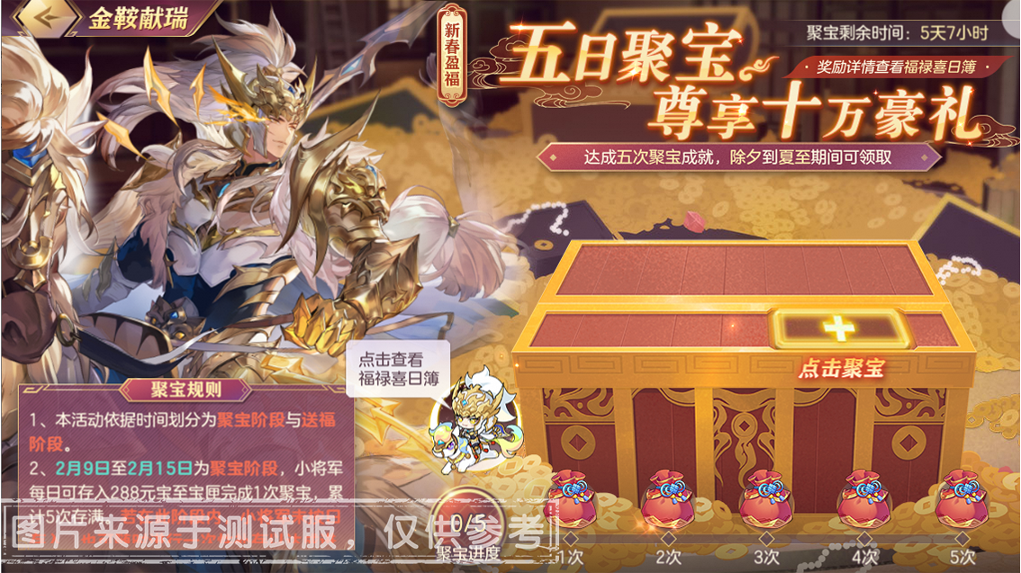 新春盈福,小将军在2月9日至2月15日聚宝阶段,每日存入288元宝至聚宝宝匣完成一次聚宝。累计存满5次即可完成聚宝目标,可在2月16日进入活动送福阶段,此前存入的元宝将膨胀至价值十万元宝的豪礼(具体奖励详情可点击【福禄喜日簿】进行查看)。小将军可在除夕至夏至日期间登录游戏领取豪礼。还望小将军们聚宝多多,财运满满!