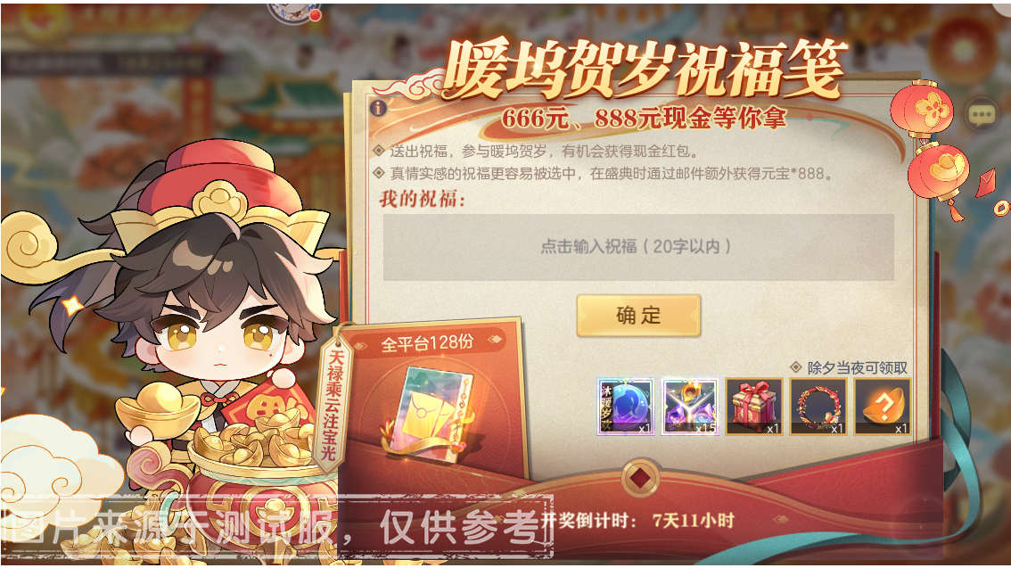活动期间,小将军可以点击右下角【祝福赠礼】填写祝福语,并参与「88-888元现金红包」抽奖。完成填写后,小将军即可在2026年2月16日17:00除夕盛典开放后,获得「沐暖岁欢命魂信物任选」*1、「命魂石任选三选一」*15、「骐骥驰骋·新春礼盒」*1、「鸿运骐骥头像框」*1、「暖坞贺岁元宝礼(随机888~1888元宝)」*1,且有概率获得「88-888元现金红包」!