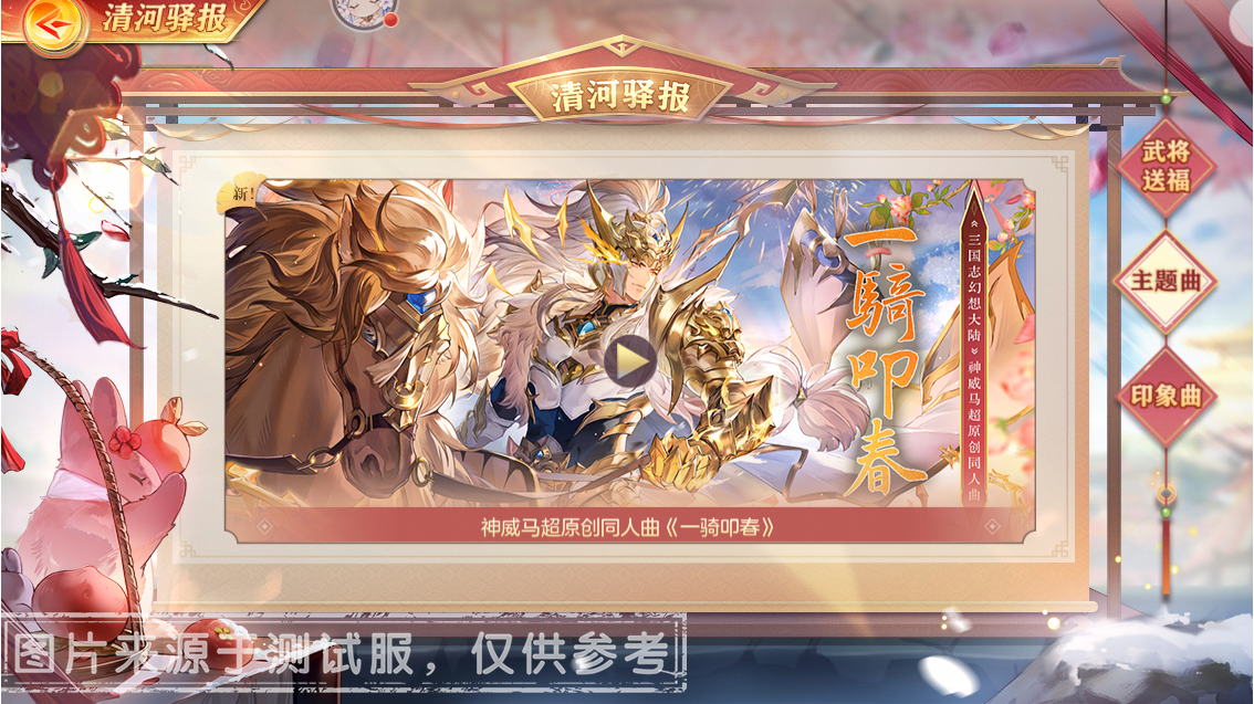 春节活动一阶段期间,小将军可游玩“骏影逐风”小游戏收集武将精彩时刻,填写暖坞贺岁祝福笺,参与“金鞍献瑞”聚宝纳福,并前往“泉喧话岁”查看武将温泉坞分享帖等新春贺岁活动,获得包含「法正·春宴煮雪」、「鸿运骐骥头像框」、「唤魂招募券」、「沐暖岁欢命魂信物任选」、「骐骥驰骋·新春礼盒」等在内的丰厚奖励,更有机会抽取「88-888元现金红包」!