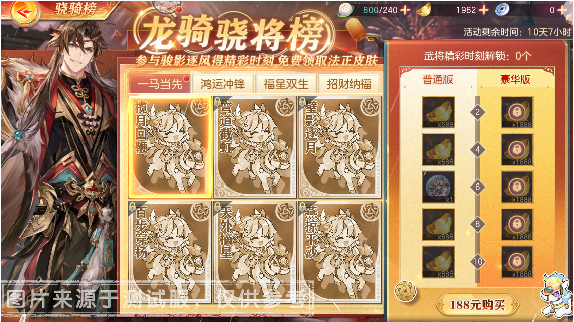 活动期间,参与骏影逐风活动获得武将的「精彩时刻」后,小将军可以前往【骁骑榜】解锁对应的图鉴,并获得包含「唤魂招募券」、「幻穹券」、「辰星金轮」等在内的奖励。小将军解锁的武将精彩时刻图鉴达到指定数量时,可在【龙骑骁将榜】中领取大量元宝、【沐暖岁岁欢】特辑表情包及「法正·春宴煮雪」奖励。同时,小将军可以选择花费188元解锁豪华版,额外获得大量元宝。