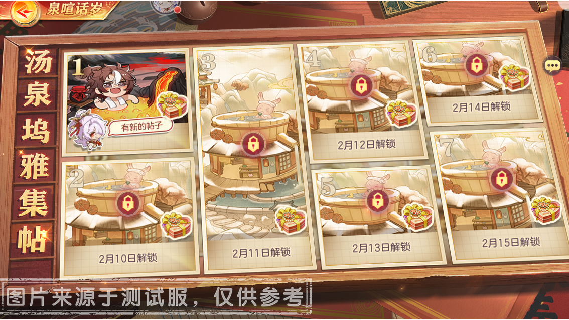 进入西凉的温泉山庄后将会开启各位武将的温泉讨论帖,查看各位武将的温泉体验帖子并评论盖楼即可获得元宝、「花灯·圆形宫灯」等道具奖励。
