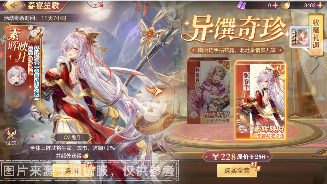 送福迎春之际,“孙鲁育&张春华”携全新史诗“异馔奇珍”系列皮肤,于“春宴笙歌”中限时上架!枕雪听岁·孙鲁育:活动期间限购1次,售价98元,可搭配价值30元的涟漪·枕雪听岁动态头像打包出售,打包折扣售价:118元。
