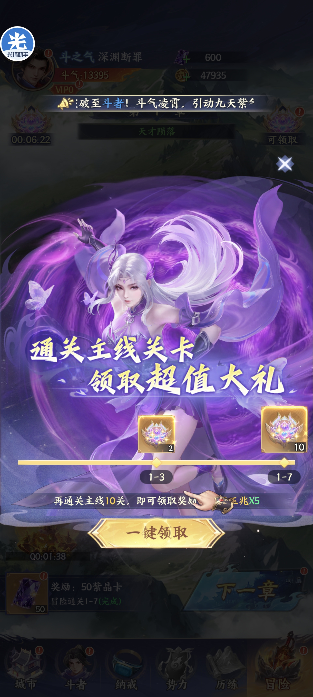 过完第一章,境界突破,可以领取免费的抽卡券(以下简称普抽),是我们零氪玩家获取普抽的重要途径之一。