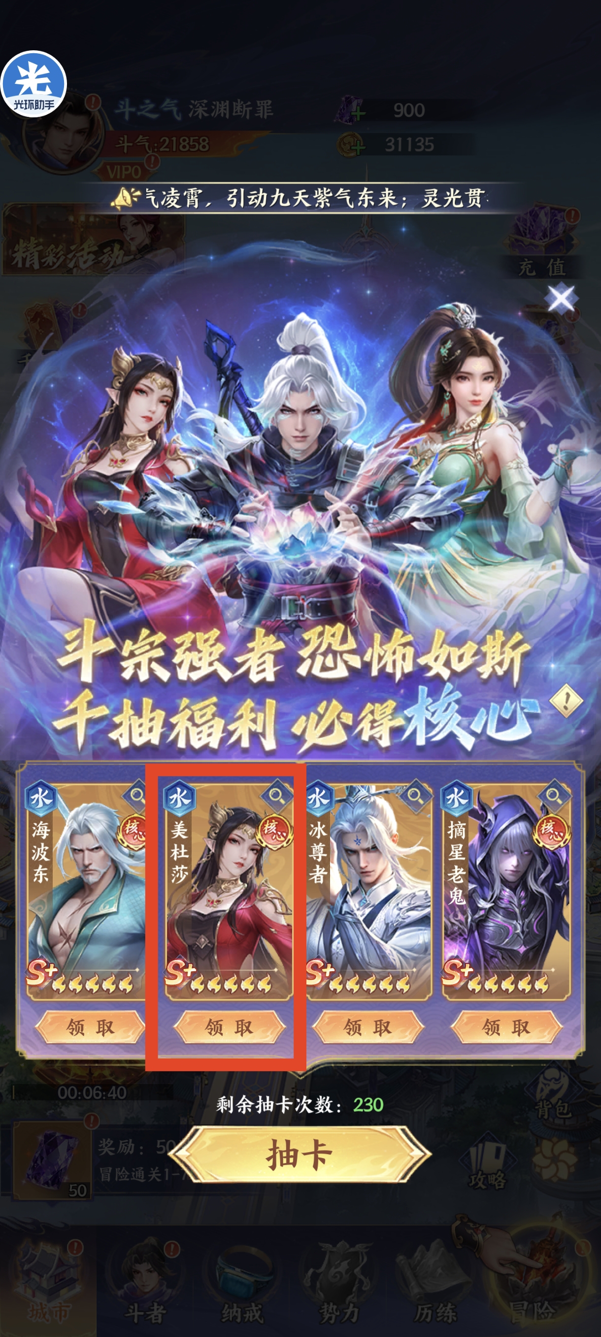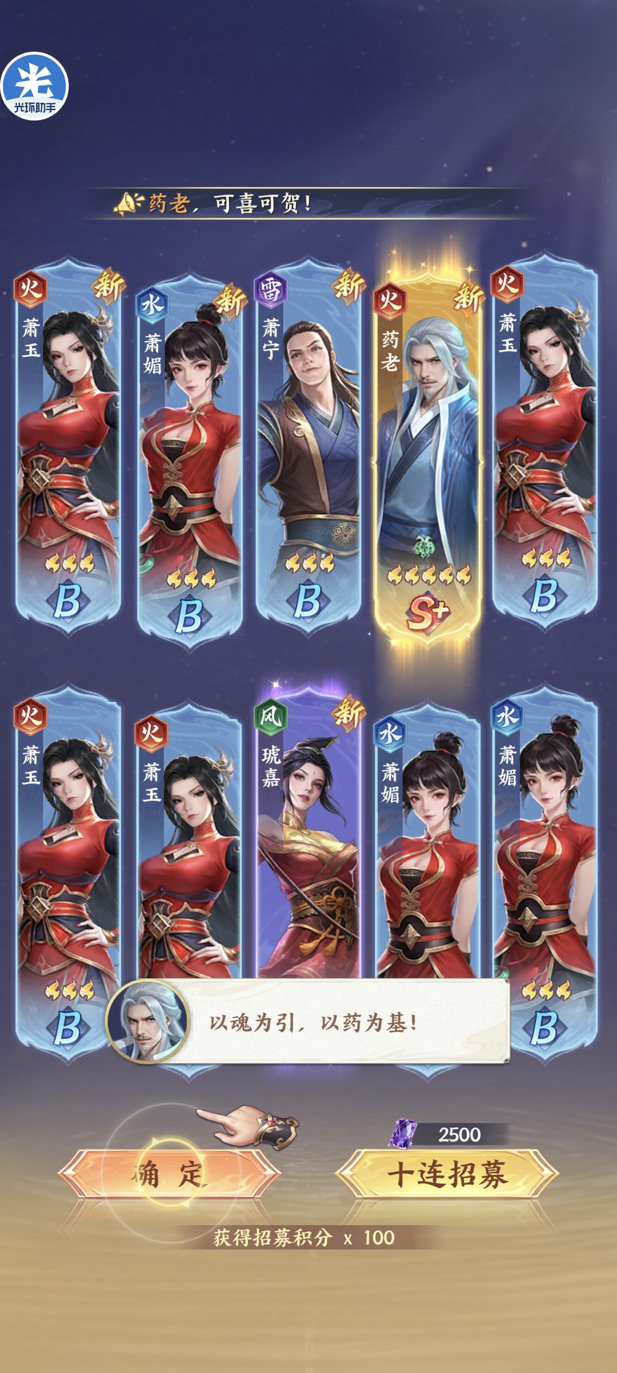 引导过程中会获得今天的第1次十连抽,固定抽到药老,比较斗破游戏嘛,随身老爷爷是必须的,先过渡用着。