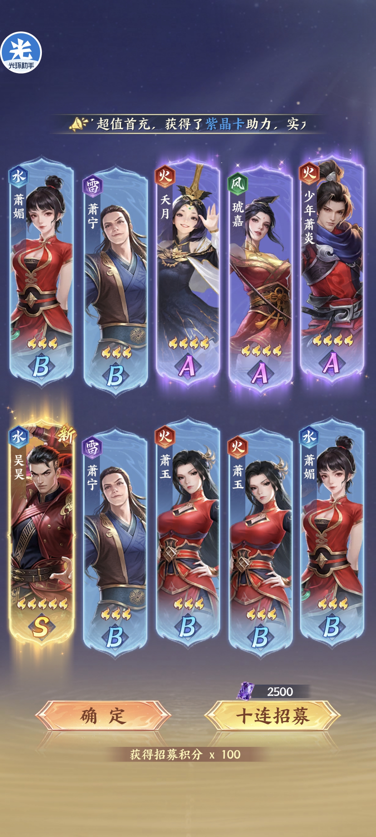 领取完各种签到奖励后,凑齐今天的第2-3次十连抽,成功抽到吴昊,只要是水系,无论品级前期都可以直接上阵使用,凑出前期开荒阵容。