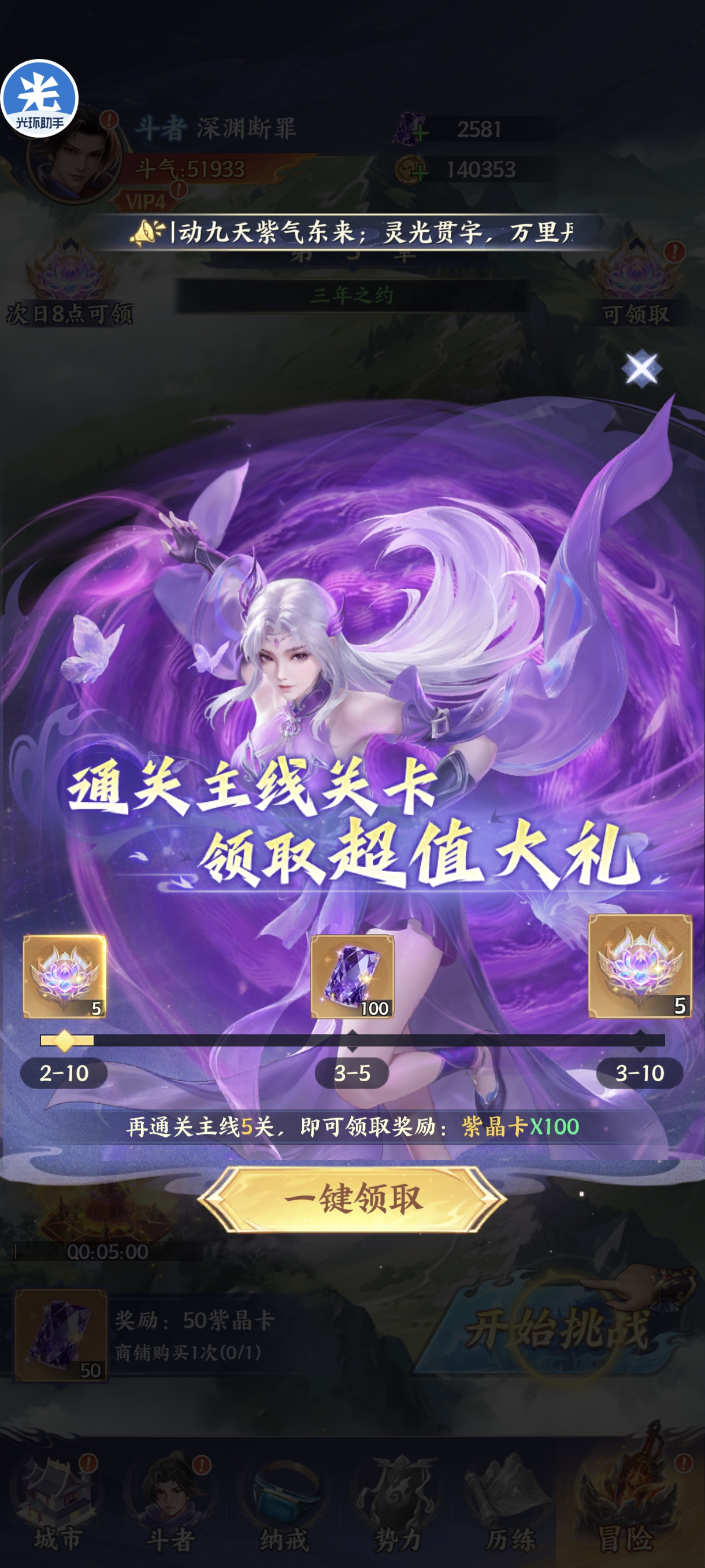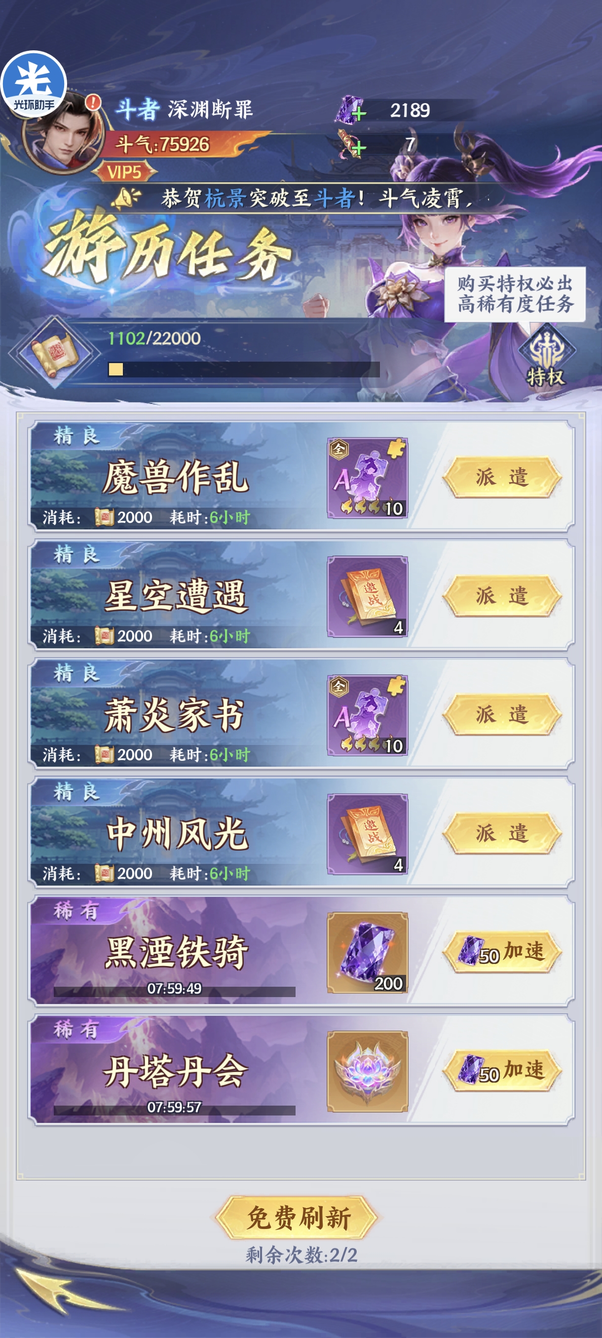 一直推图到5-10卡等级,解锁游历系统,因为游历值有限,所以尽量刷新出紫色稀有以上的游历任务完成,获得更多奖励。