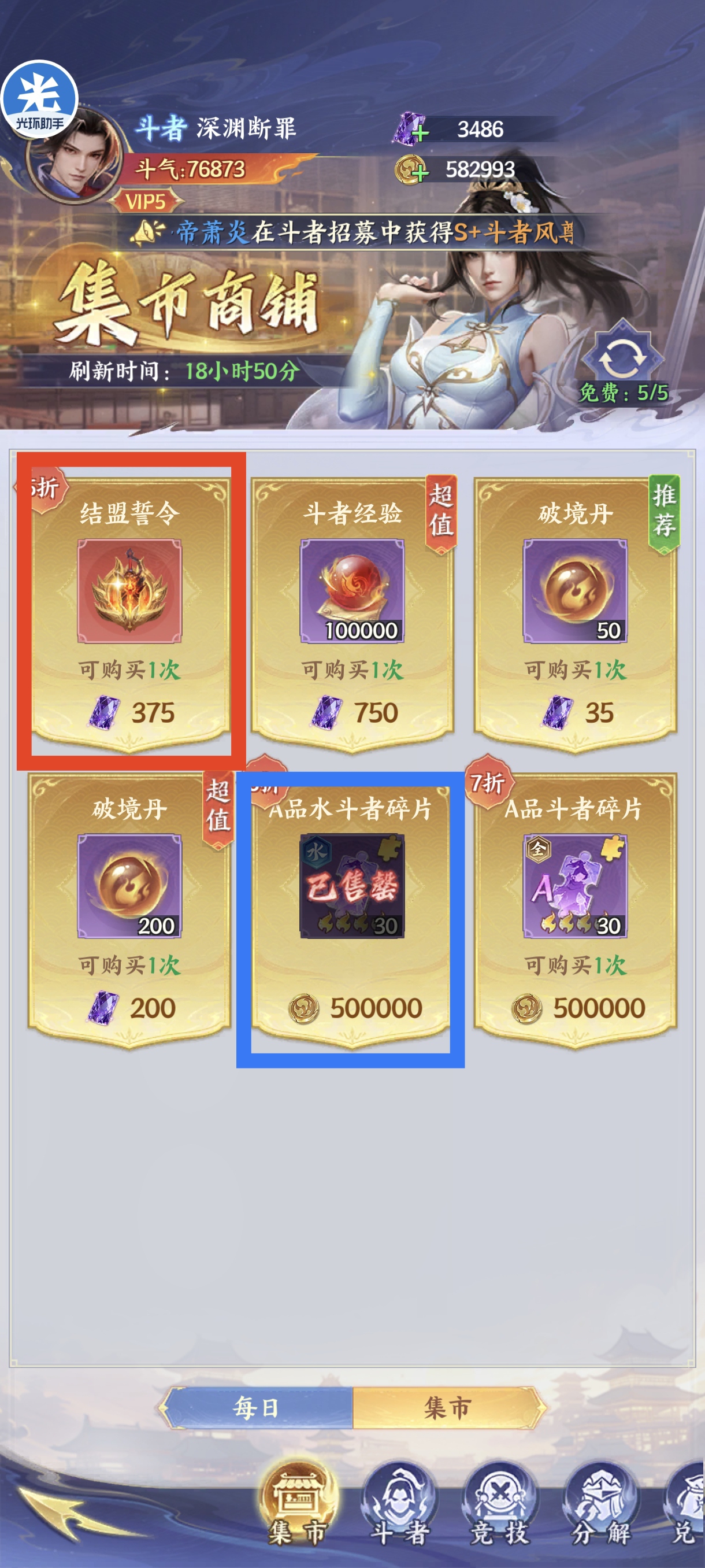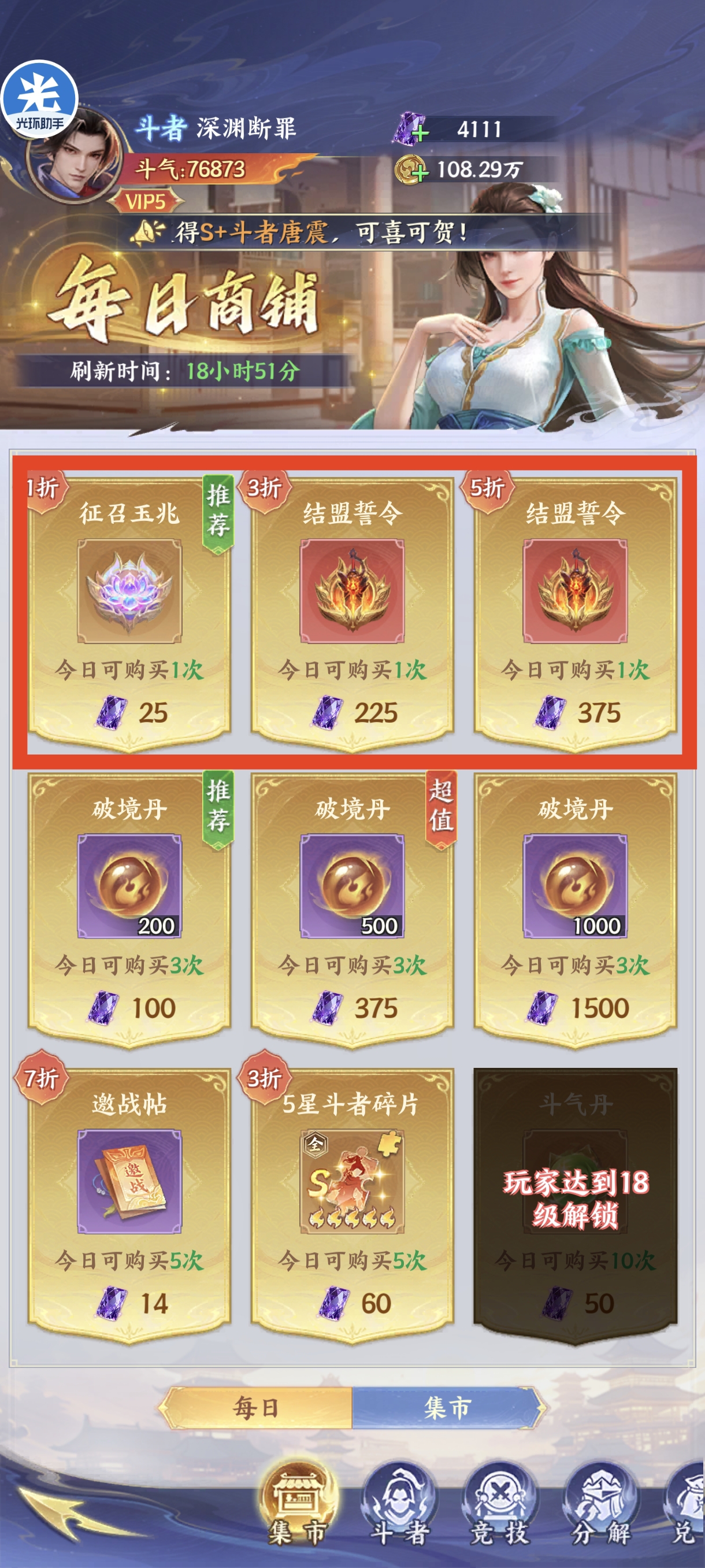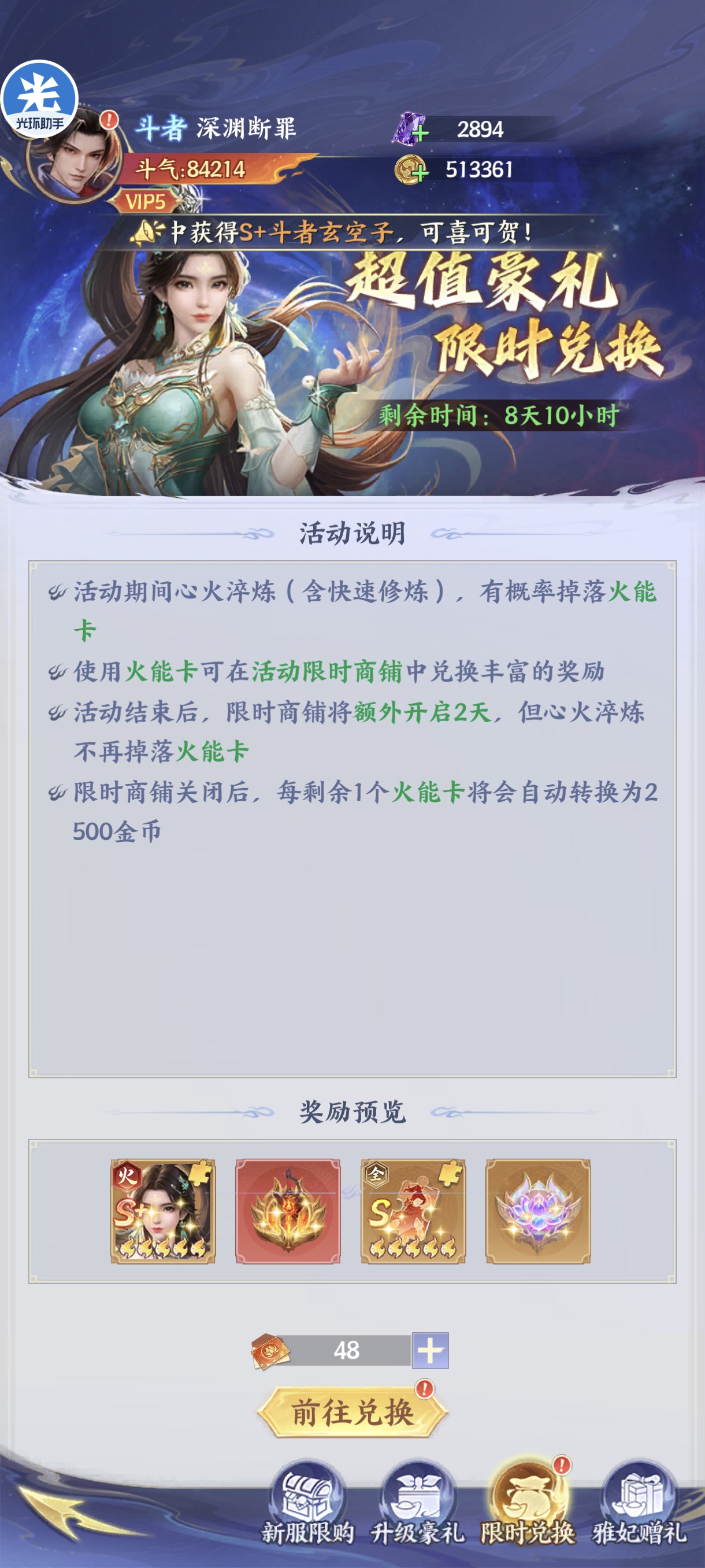 通过快速修炼提升等级,就能继续推图了,升至18级后,解锁限时商店,可通过挂机和快速修炼掉落【火能卡】,商店兑换优先兑换萧薰儿和两种打折抽,即使我们主玩水系阵容,也需要练其他阵容英雄做活动。