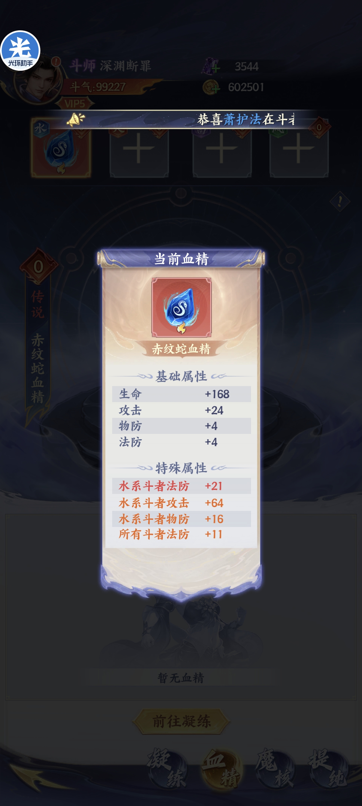 我们水系直接全部兑换成水系血精即可,将最高阶的血精装备上,其他低阶血精洗练到获得大量属性加成。