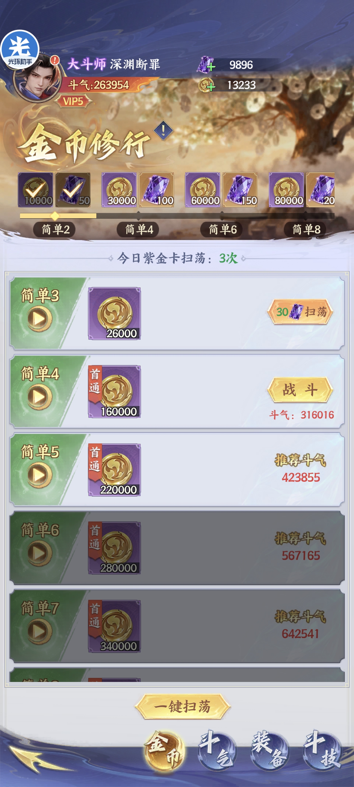将战力提升到最高,把所有历练副本打到最高级后扫荡,推荐每天所有副本买1次次数,增加资源获取。