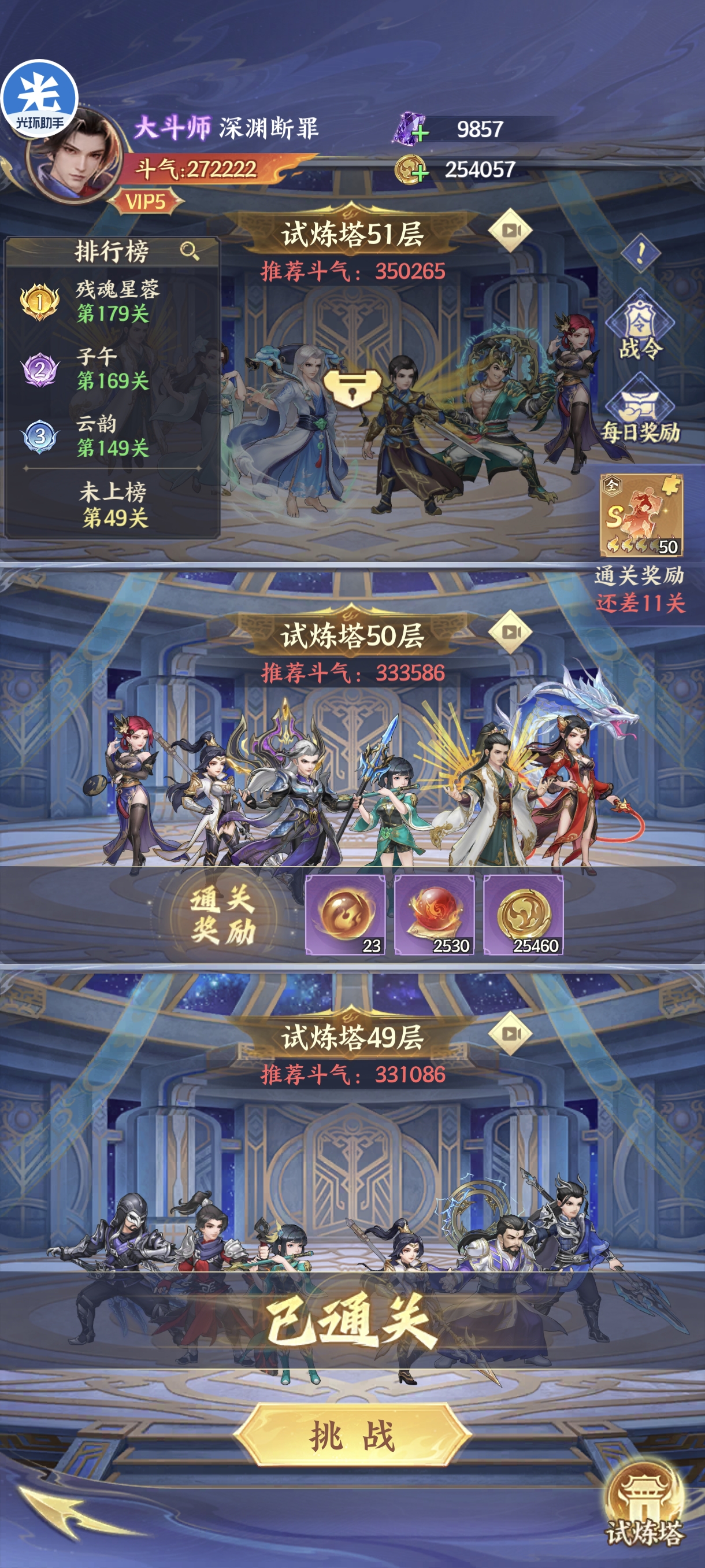 2、推图至主线10-10,试炼塔49层,竞技场64名