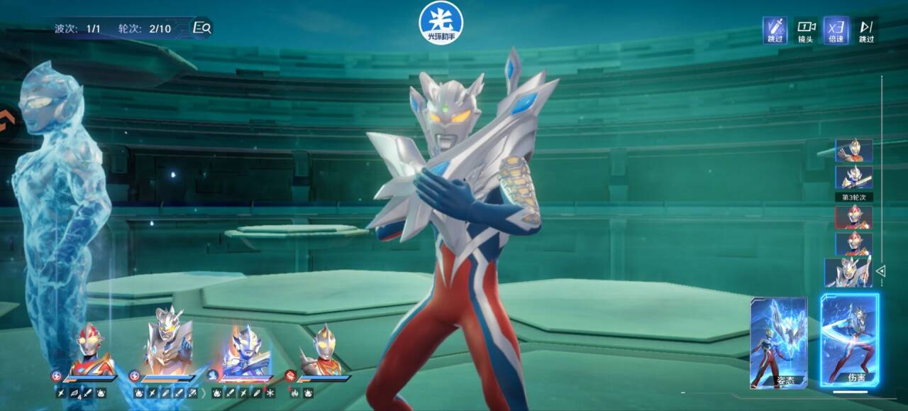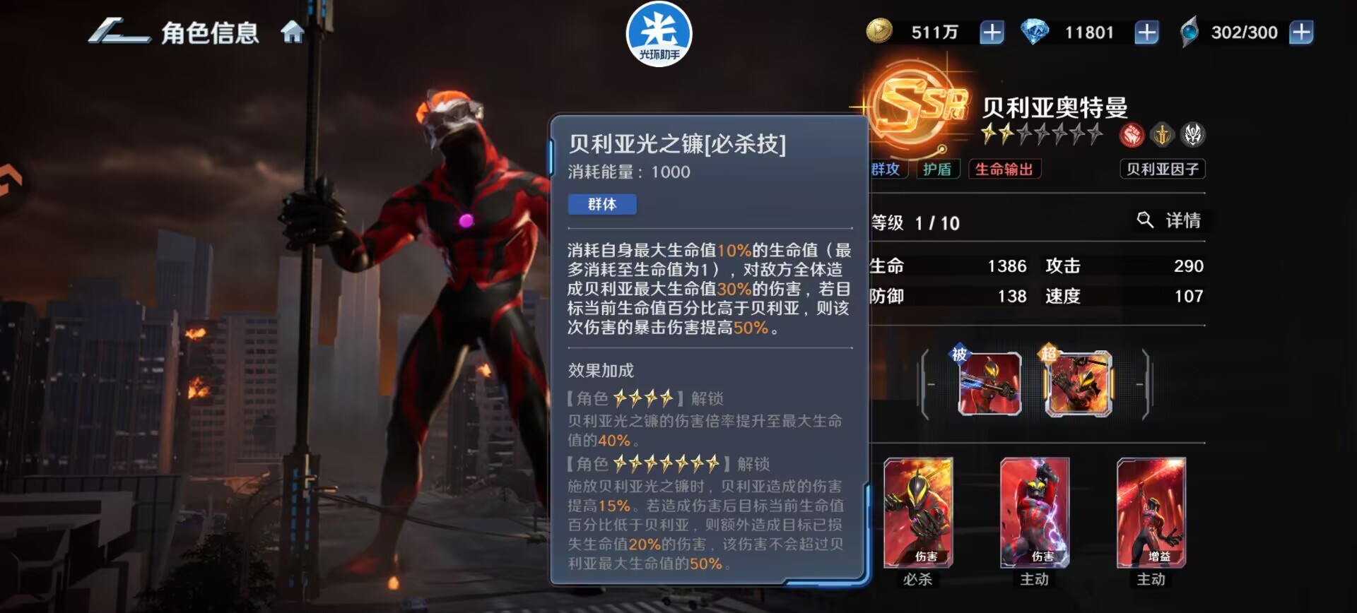解析:围绕【终极赛罗】和【贝利亚】组成的阵容,赛罗兼备强大的输出能力,具备强大对单和对单以及反击能力,同时可以将护盾转换为攻击力。