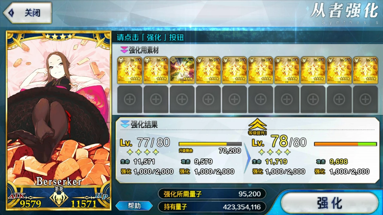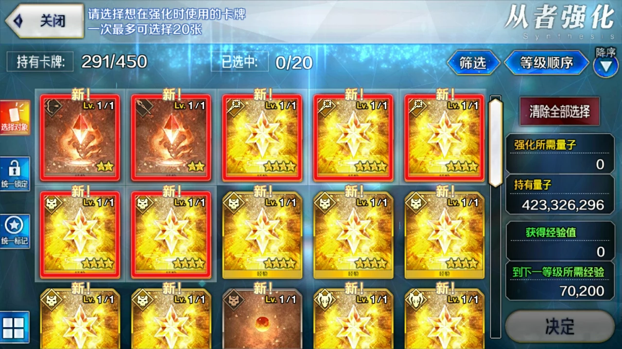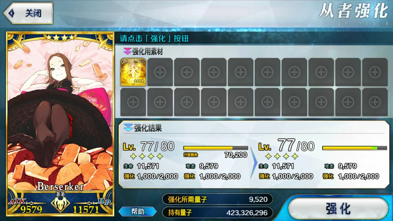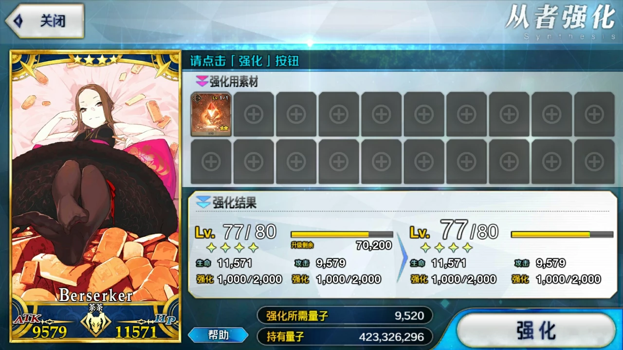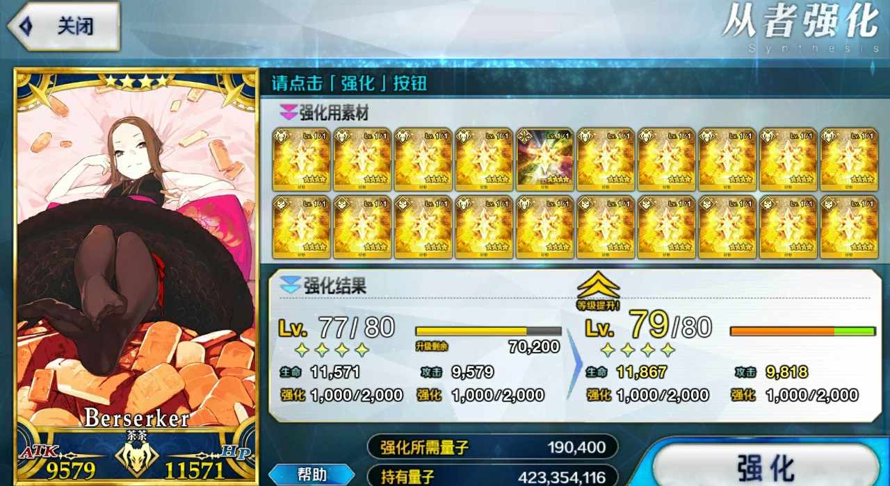 第三点的话,根据第一点,这里并不推荐一个一个去强化的,有点浪费时间,若你时间多,当我没说。也不要去用一星二星狗粮卡,同一从者等级下fgo是根据狗粮卡个数计算所消耗的量子,等级越高消耗越多,