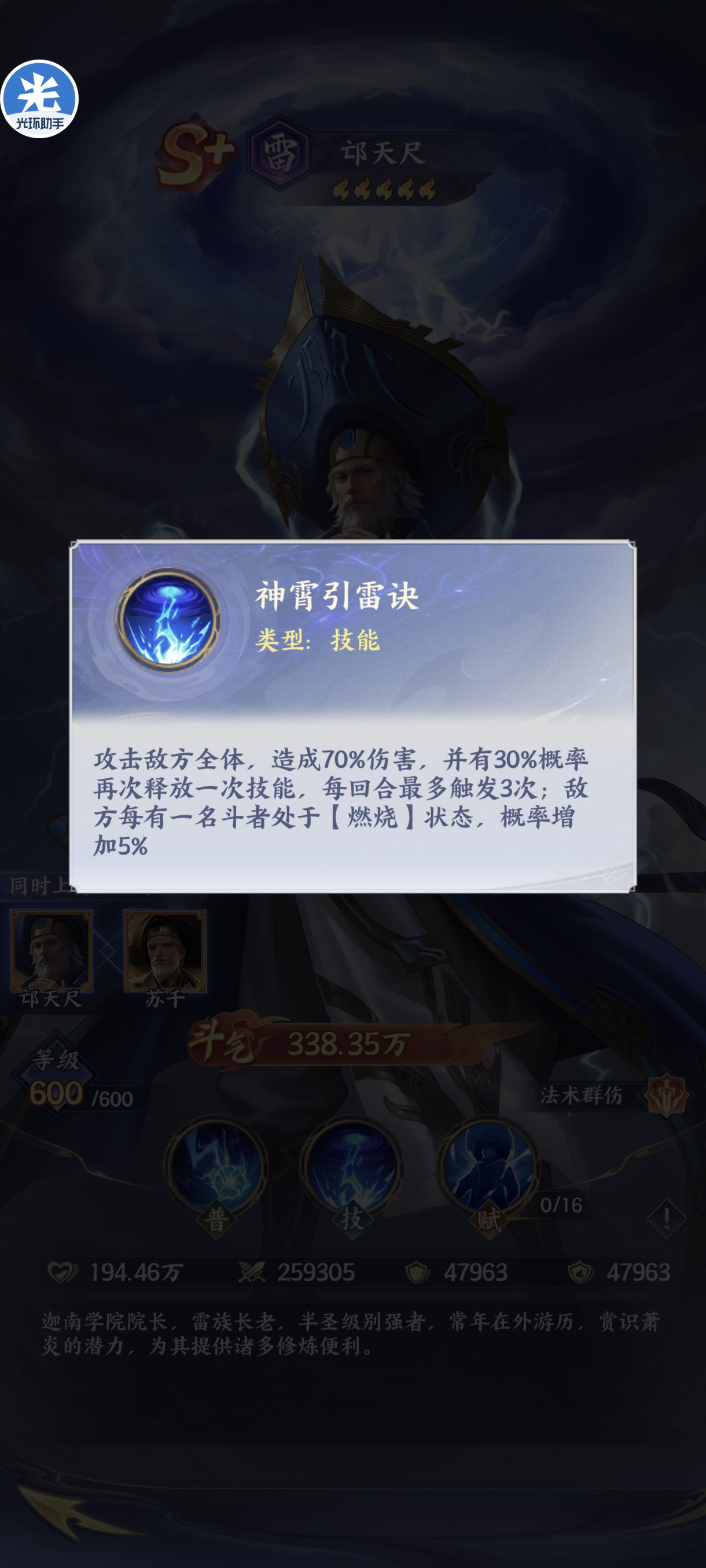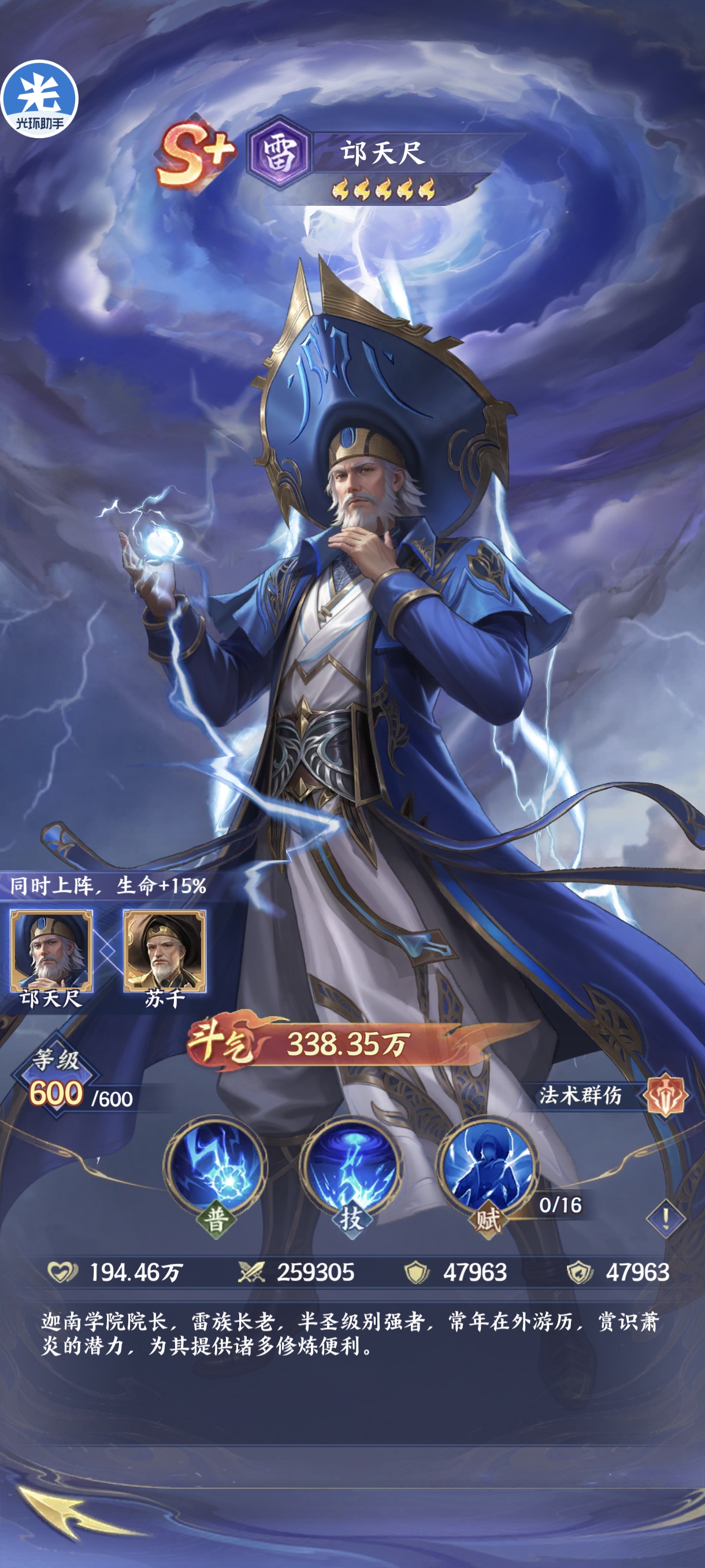 除邙天尺外全S以下英雄,前期成型很快,凑3雷3火吃斗阵加成过渡。