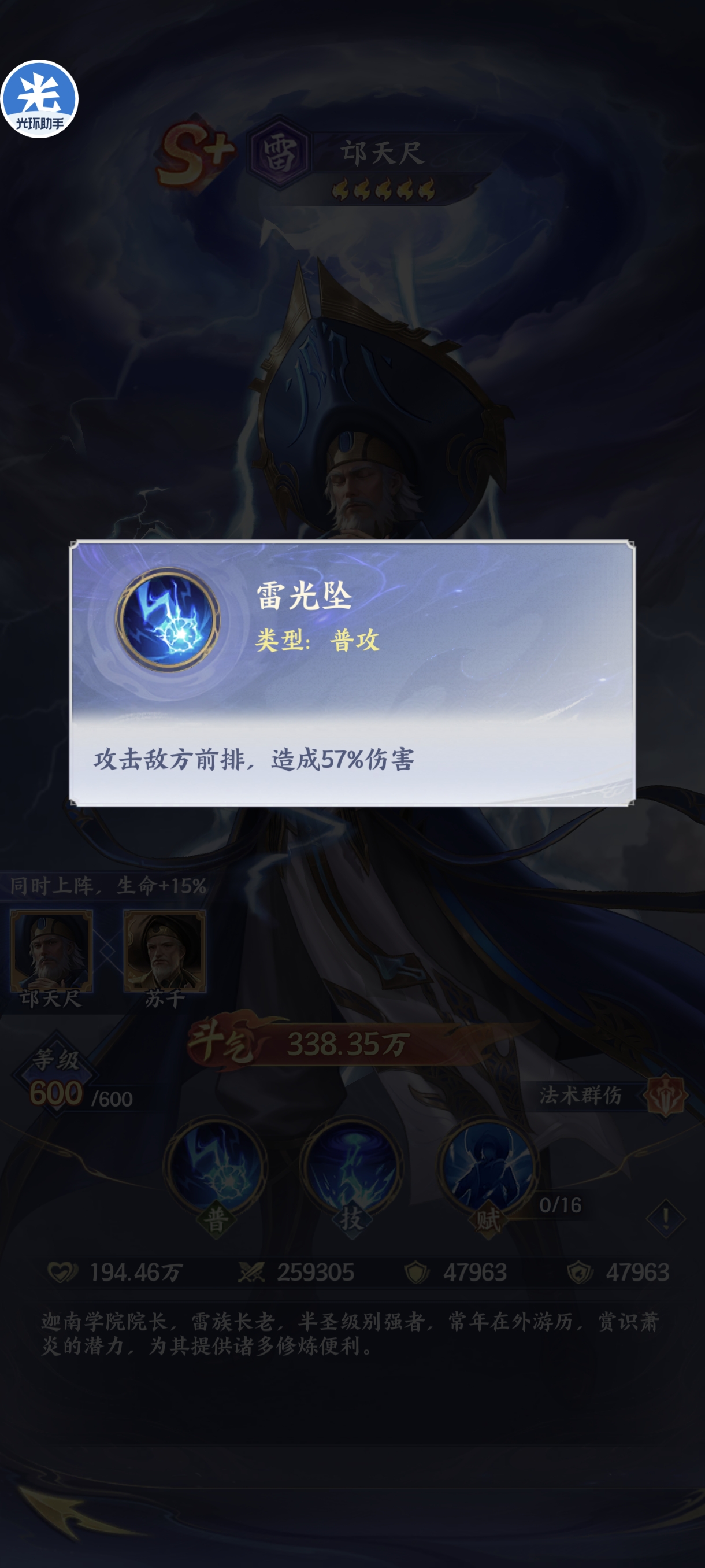 最后用苏千替换玄衣,苏千除了有治疗和回怒机制外,更有雷阵营光环,提升自身和主C邙天尺的防御和减伤。