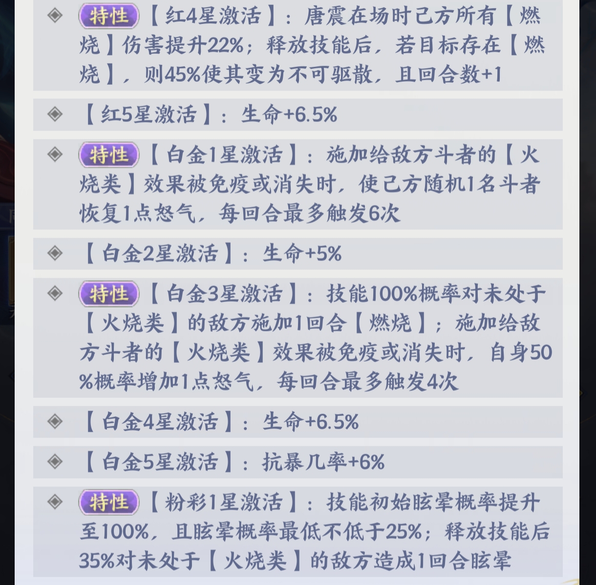 唐震除了增加火伤外,还有对燃烧目标高几率眩晕的特性,将敌人控制变相降低我方承伤,为燃烧出伤争取更多时间。