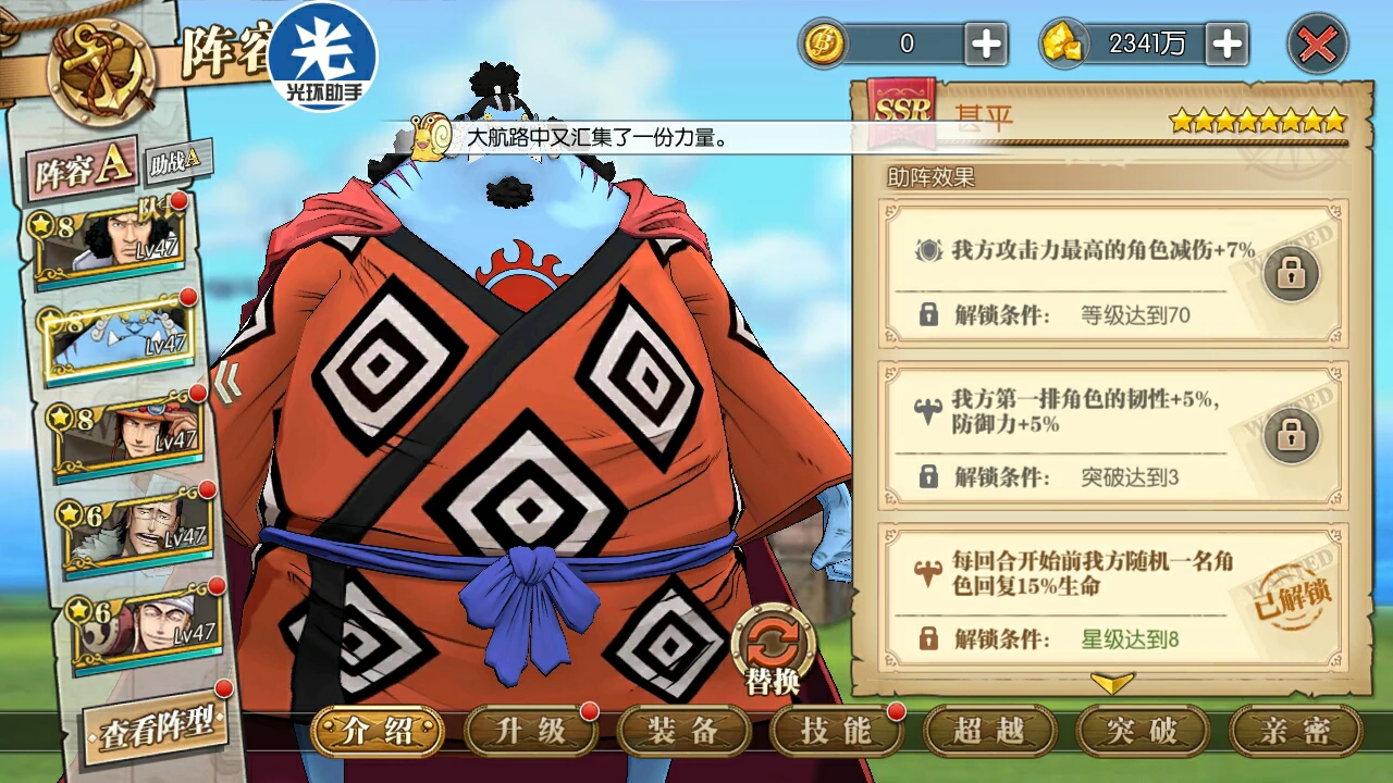甚平在经历了这么多风浪之后,逐渐从第一,慢慢往下掉,逐渐不能上场。特性:锁血,有回复能力,同时输出也不低。甚平在高端局已经不太常见,因为小马和麦哲伦的克制回血,让甚平的回血能力大幅降低,但目前大部分玩家还不只是菜刀队,只有高端局才会出现国家队,低端局中的国家队练度也达不到那个高度,所以甚平还能在游戏中有一袭之地,平民的使用价值仍然很高,不管是PVP还是剧情都有奇效。缺点:锁血在目前版本已经不太够看,血量相较于新的肉限定已经不算太高。