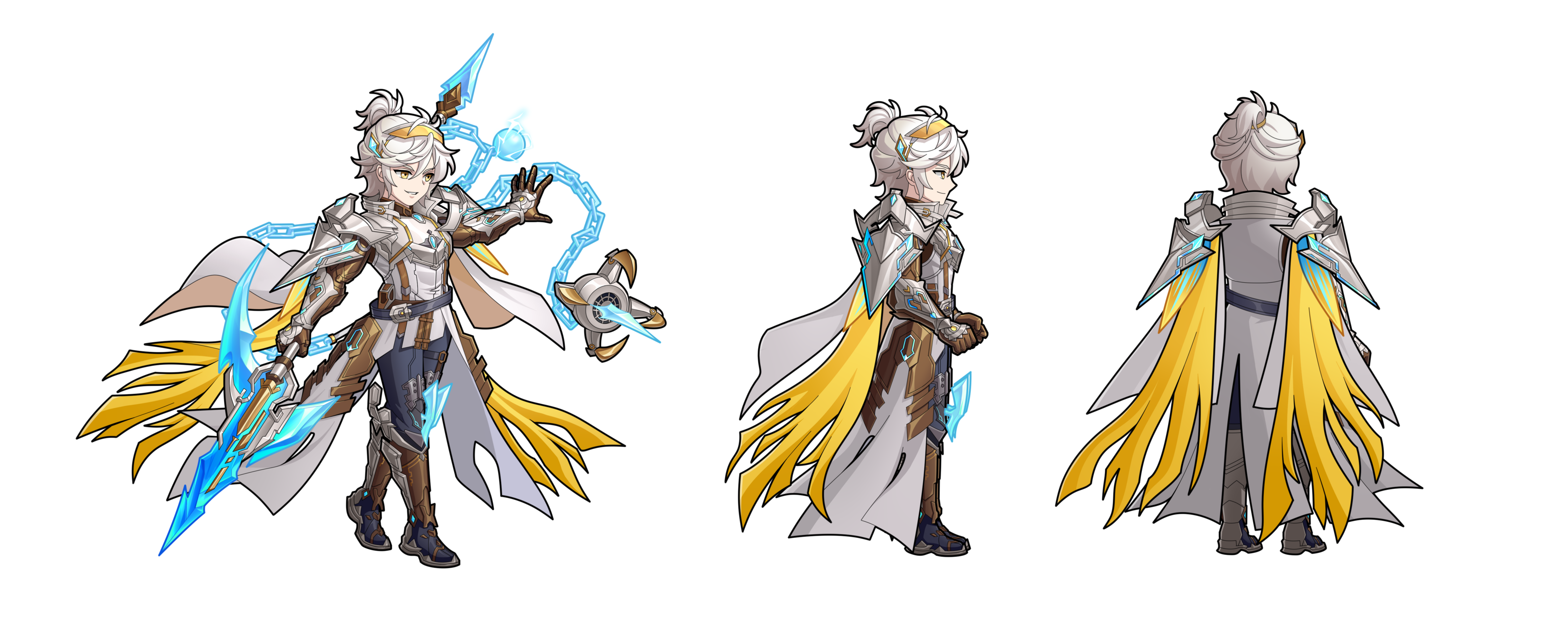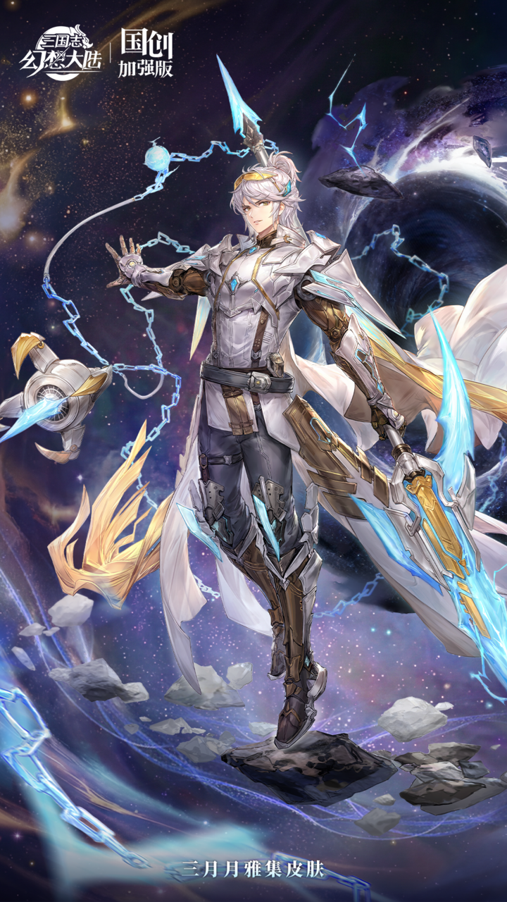 本次设计以宇宙星尘为核心元素,以银灰色为主色调,尝试将武将和未来幻想相结合。马岱化身“深空追猎者”,身披金属质感的流银软甲,色泽冷冽、线条流畅。他一手持长枪,一手掌控锁链,浅蓝色流光缠绕其间,仿佛掌握着亘古星辰的脉络,挥动间便要重塑纪元。