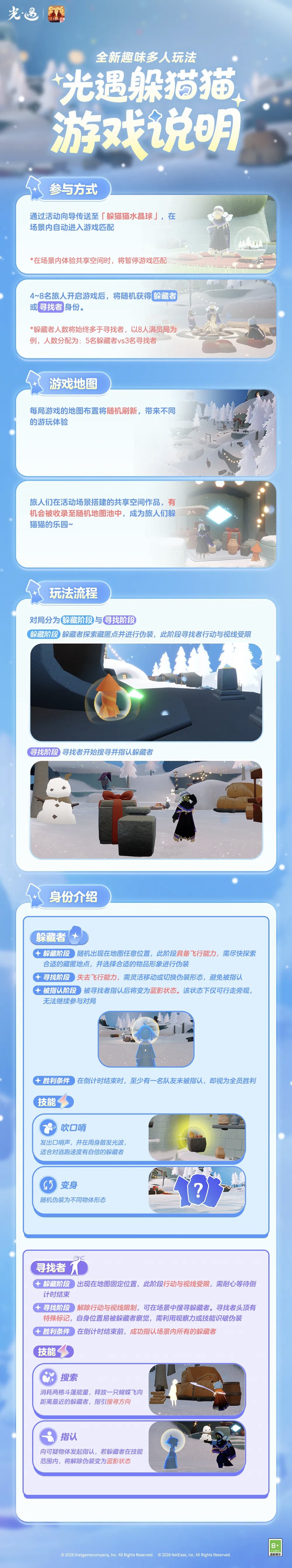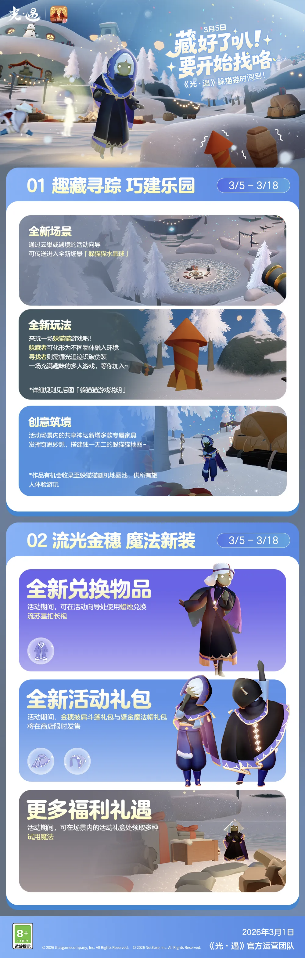 藏好了叭!要开始找咯~丨《光·遇》躲猫猫更新内容公告是泽哦发布于 03-01关注化身物件隐于光影之间穿梭场景寻觅藏匿身影🪄《光·遇》躲猫猫将于3月5日开启请旅人们仔细阅读更新公告,了解更多活动信息🏆3月5日~3月18日快来开启这场趣藏寻踪之旅吧