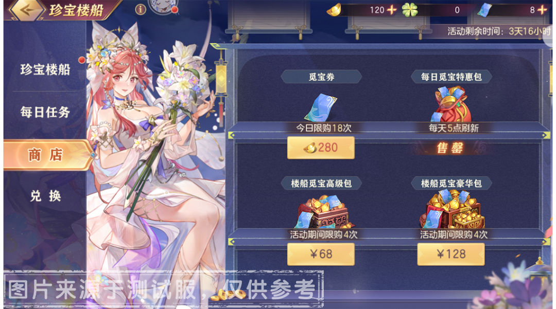 楼船觅宝豪华包:内含「觅宝券」*70、元宝*1280,售价128元,活动期间限购4次