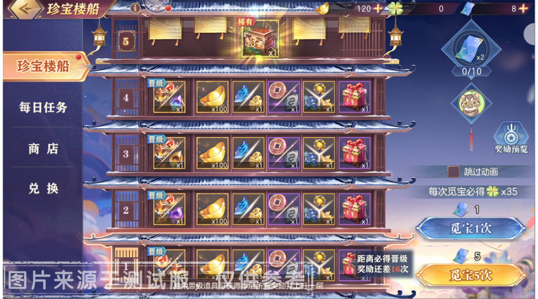 活动期间,小将军通过每日任务和商店获得活动专属道具「觅宝券」,并消耗「觅宝券」参与【珍宝楼船】进行道具抽取。若抽中当前层级晋级奖励即可获得本层所有奖励并进阶至下一层,在升至5的倍数层时可以直接获取该层大奖。
